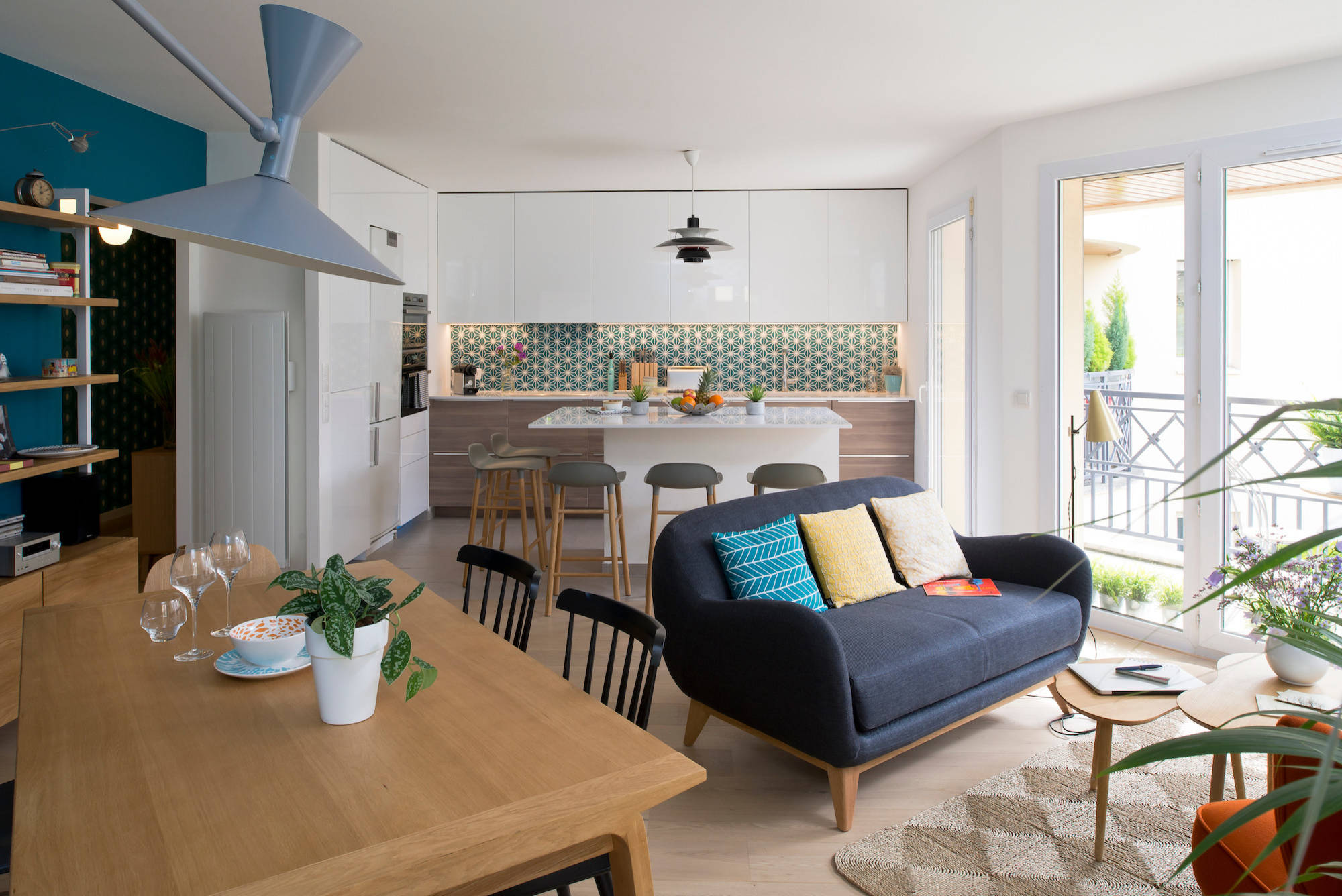 Après plusieurs rendez-vous et un large questionnaire concernant leurs goûts au sens large, le professionnel a proposé à la famille d’établir un fil conducteur pictural et graphique : une alliance de bleu canard et de motifs géométriques qui sera déclinée dans tout le logement. Autre préconisation : changer le parquet de teck foncé par un parquet en chêne blanchi.