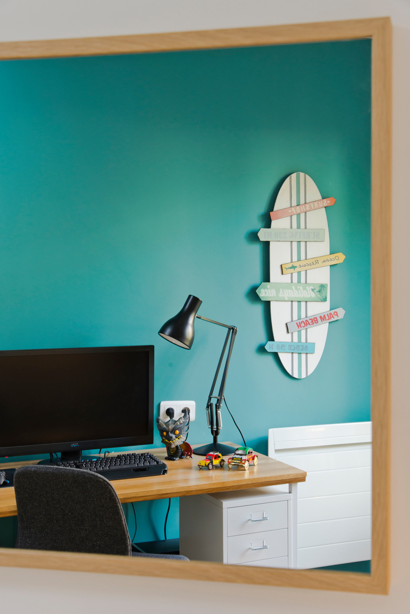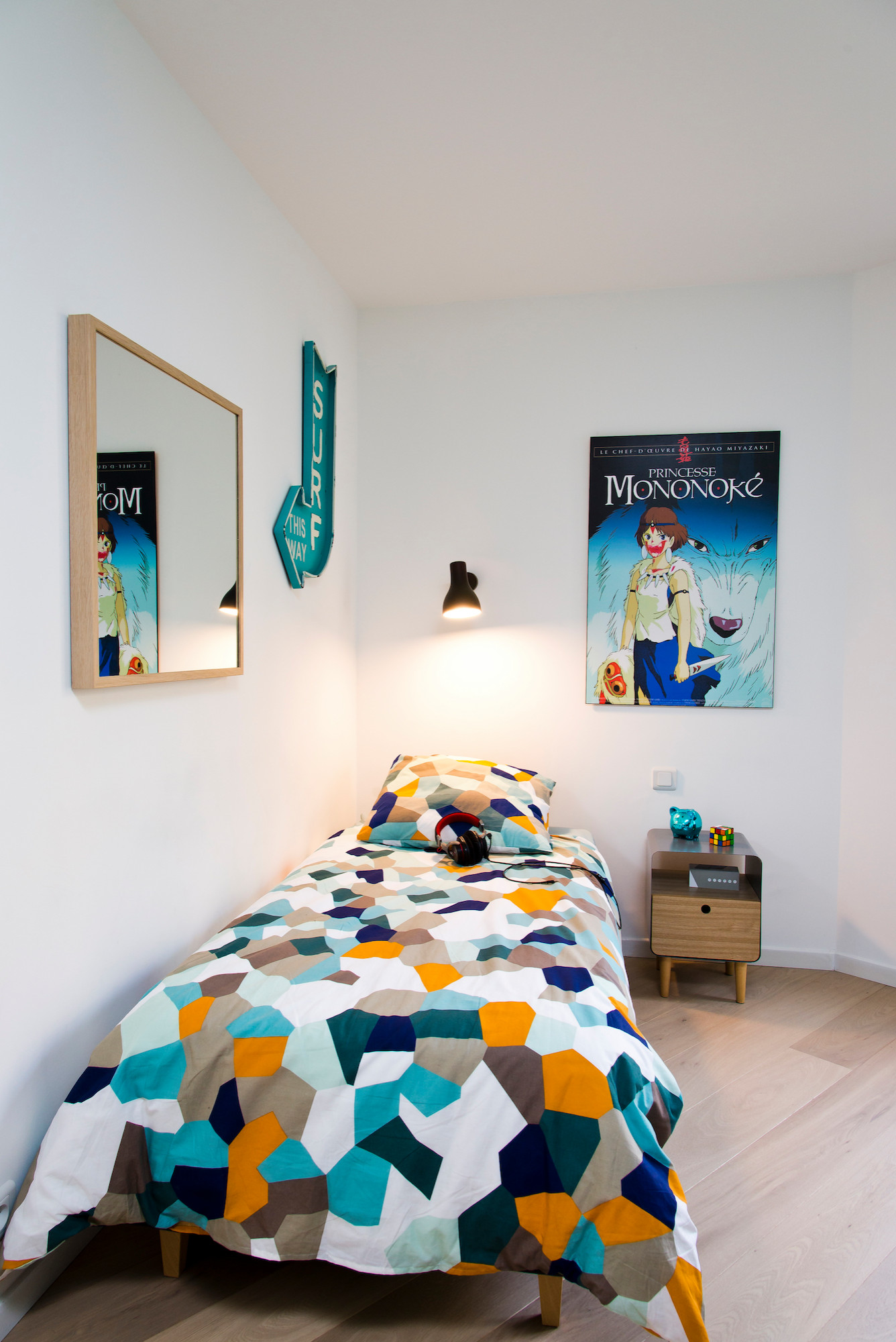 Fan de surf et du réalisateur Miyazaki, le collégien a opté pour une affiche du chef-d’œuvre d’animation Princesse Mononoke et des objets déco tendance qui font écho aux touches tropicales du salon.