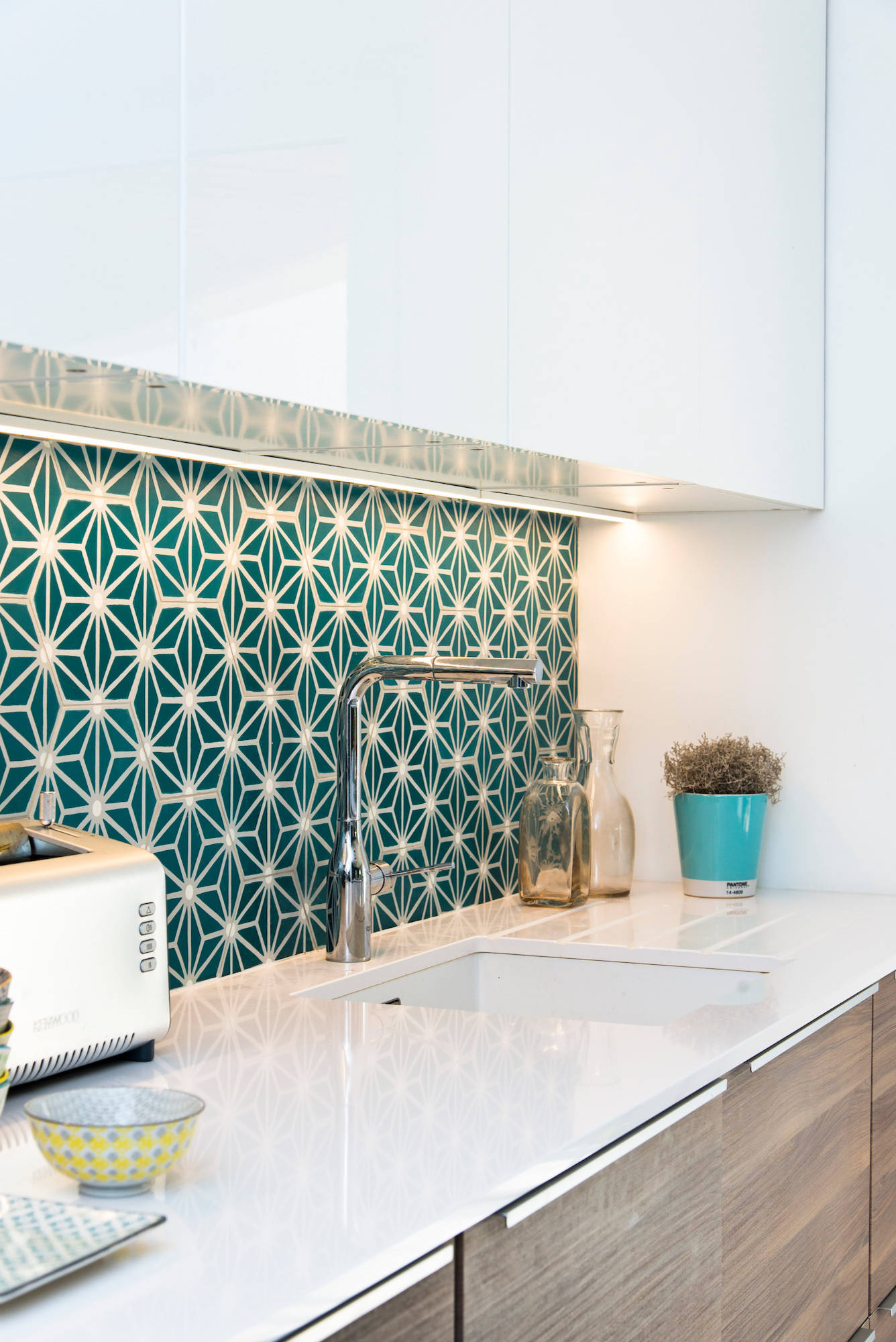 La crédence en carreaux de ciment a tapé dans l’œil de la propriétaire. Il était osé de mixer dans une même pièce une couleur vive, des fleurs et un puissant motif géométrique, mais cette liaison plutôt dangereuse fonctionne parfaitement : « Le mur bleu vif a été placé face aux fenêtres pour l’éclairer, car la couleur a besoin de lumière pour prendre vie. Quant aux motifs, ils ne jurent pas, car ils créent une harmonie avec la teinte de base », décrypte Olivier Bourdon.