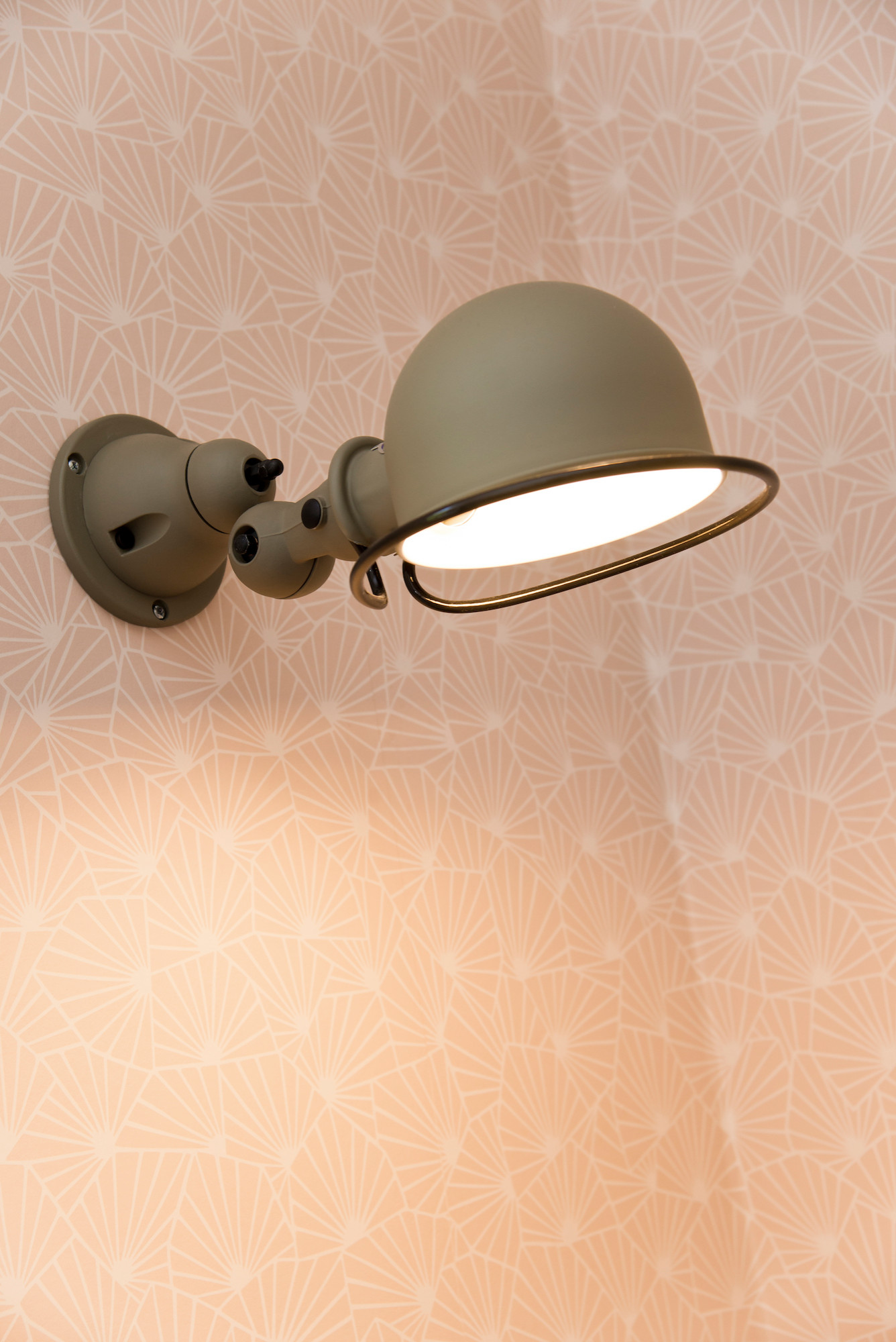 La lampe Jieldé, vert tilleul, contraste avec le rose des murs dans un duo de teintes qui s’est fait remarquer dans les récentes manifestations déco.