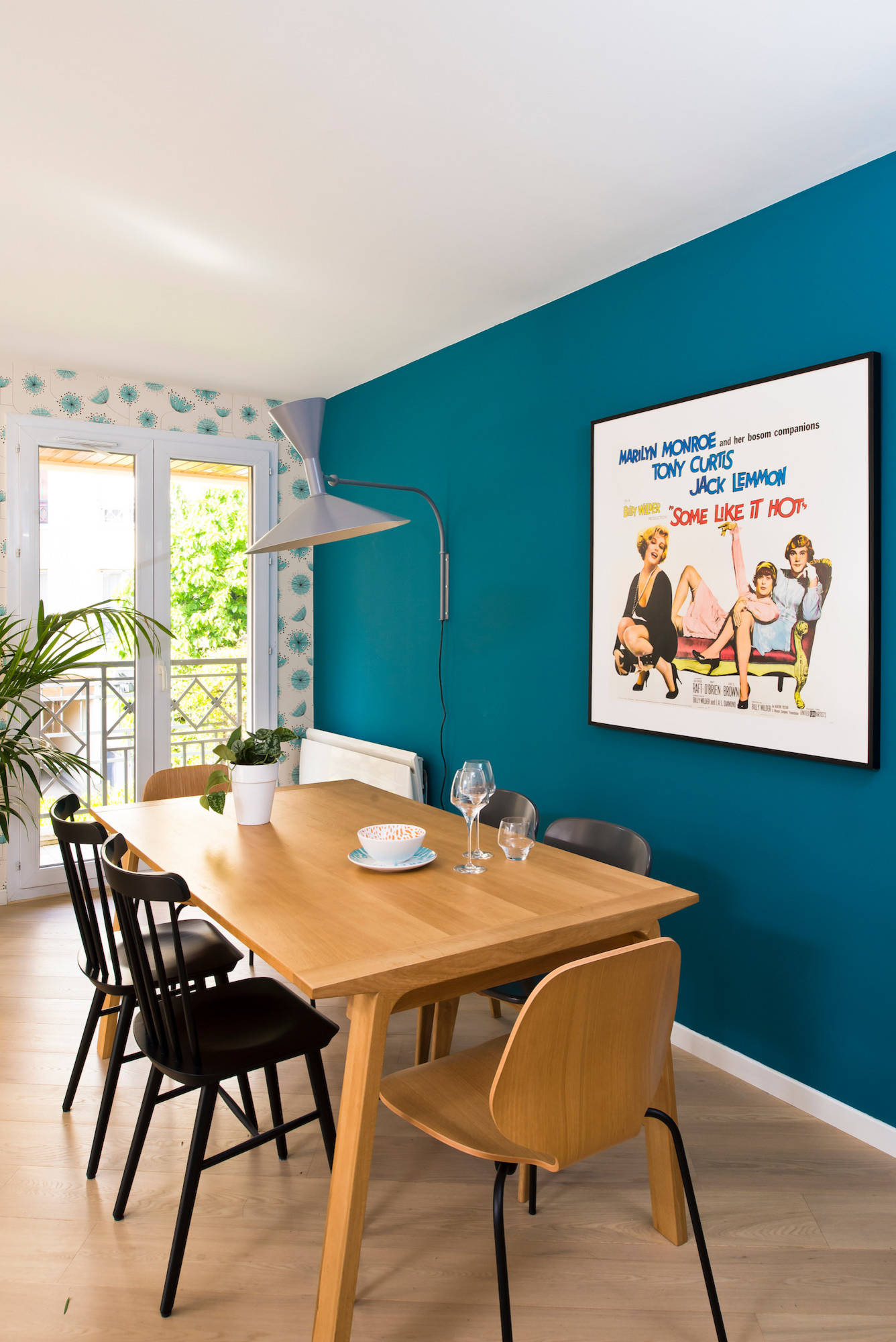 Le tonus vitaminé du bleu canard a été tempéré par un papier peint fleuri contemporain. Il en résulte un bel équilibre à la fois masculin et féminin. L’assemblage de chaises contrastées apporte du rythme. Une applique métallique en guise de lampe de table étonne par son éclairage en haut et en bas. « Passez du temps à choisir les luminaires et optez pour des modèles de caractère, car ils sont gages de finitions soignées », conseille l’architecte d’intérieur. En contrepartie, ce sont les luminaires qui ont fait grimper de façon conséquente le budget ameublement de ce projet…