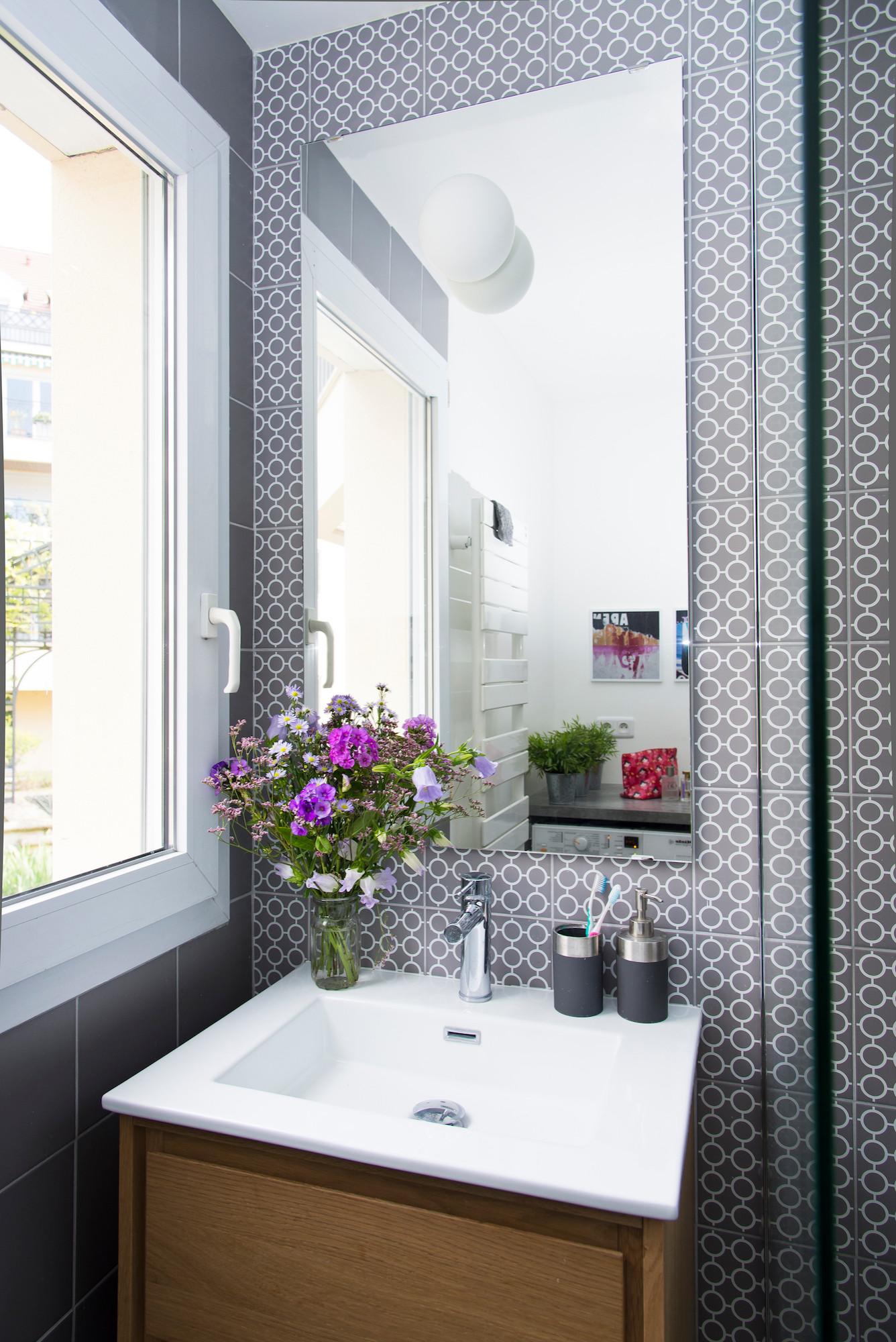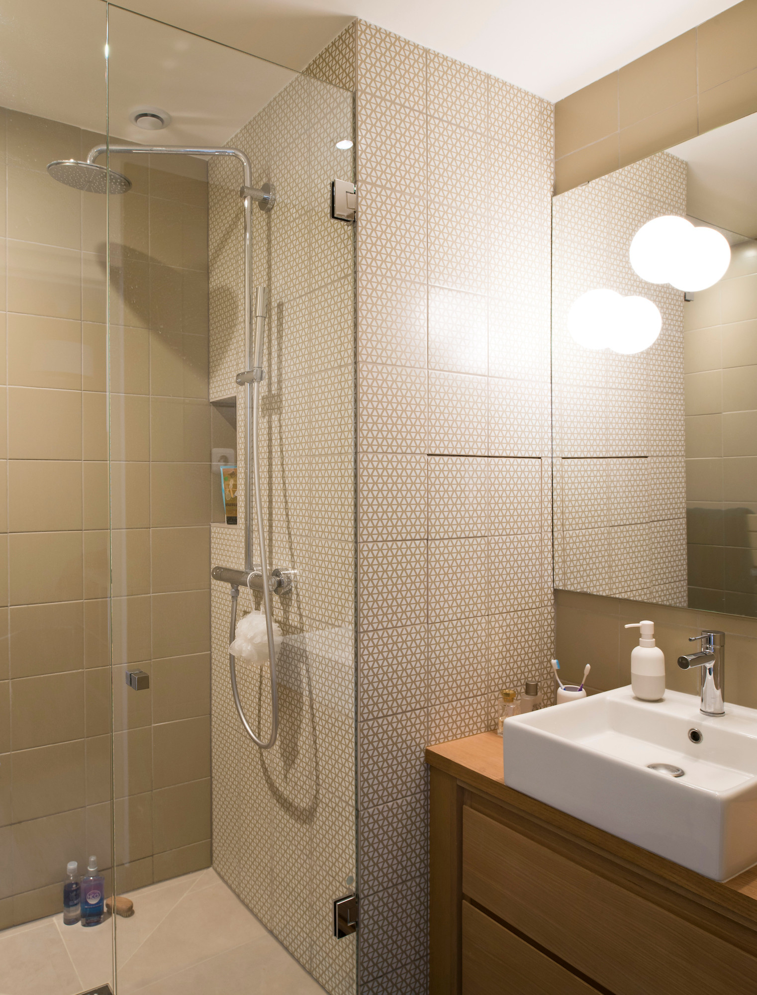 Le meuble en bois casse la froideur des carreaux.