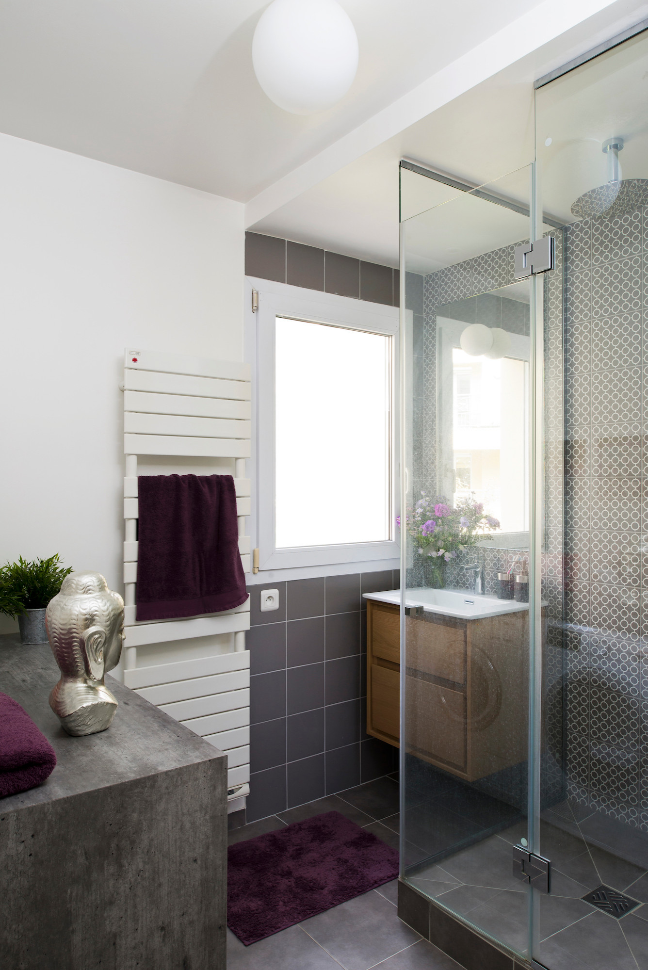 La douche a été pavée dans le même grès cérame que celui de la salle d’eau des enfants, en gris violine cette fois. Les finitions soignées se distinguent dans le type de pose du receveur, façon pointe de diamant…