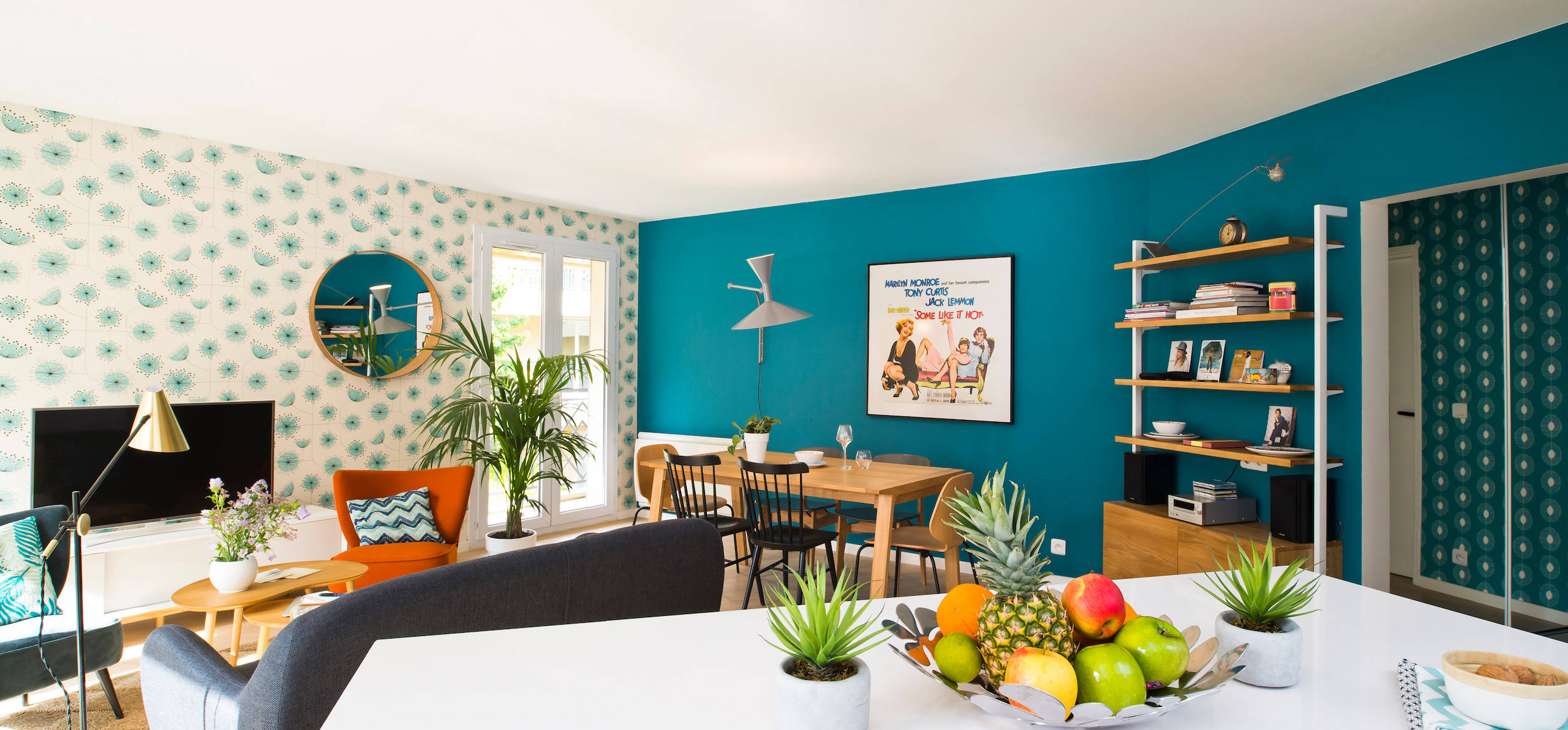 Les propriétaires ont opté pour un mobilier d’inspiration scandinave (tables, chaises, miroir…) et années 50 (fauteuils, meuble TV, affiche). Les luminaires ont été choisis pour apporter une touche métallique et design.
