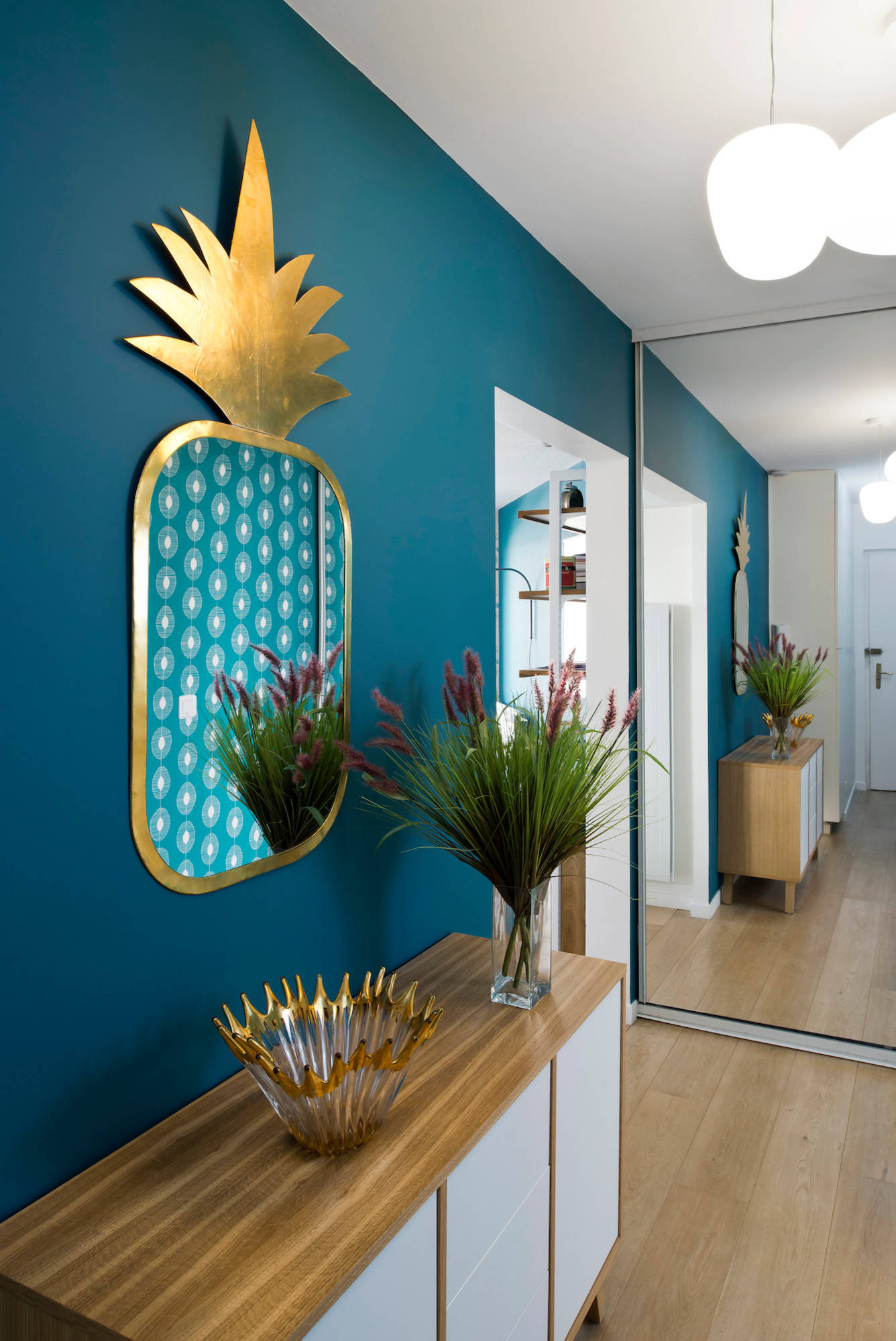 Peinture : Simple Canard chez Ressource ; Papier peint : MissPrint ; Ananas laiton : Honoré ; Buffet : La Redoute Intérieurs ; Suspension : Foscarini, Rituals