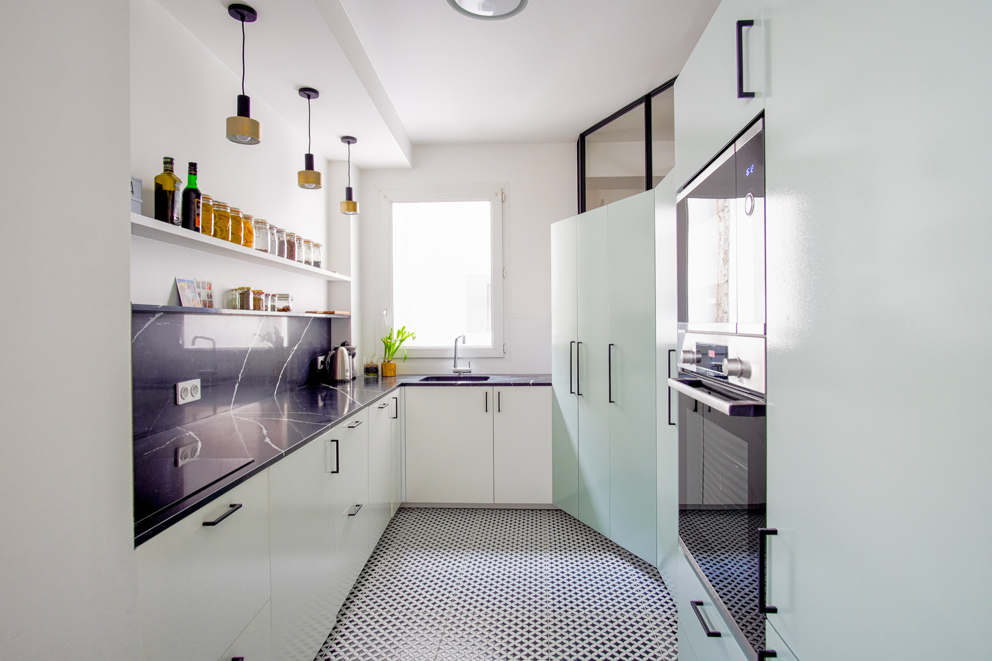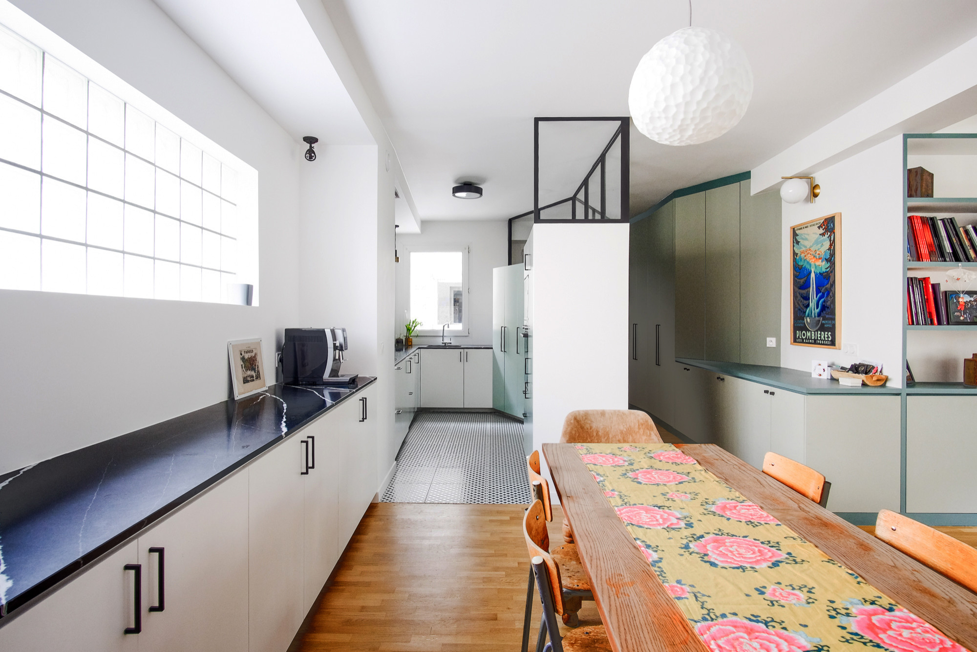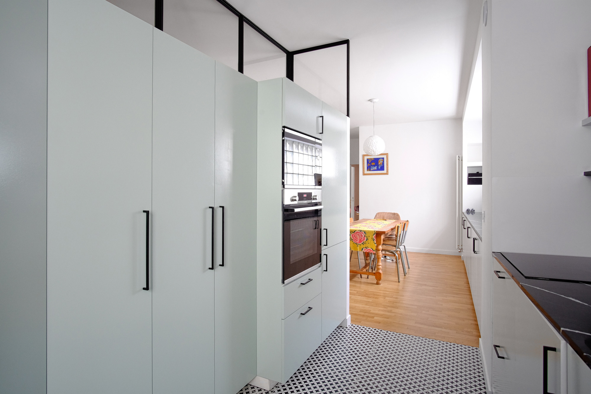 Les meubles hauts, intégrés uniquement à gauche, s’intègrent discrètement dans l’espace, en étant invisibles depuis la salle à manger. Habillés d’une teinte vert menthe, et de poignées en métal noir, ceux-ci s’associent à un carrelage bicolore et à une série de meubles bas traités en blanc.