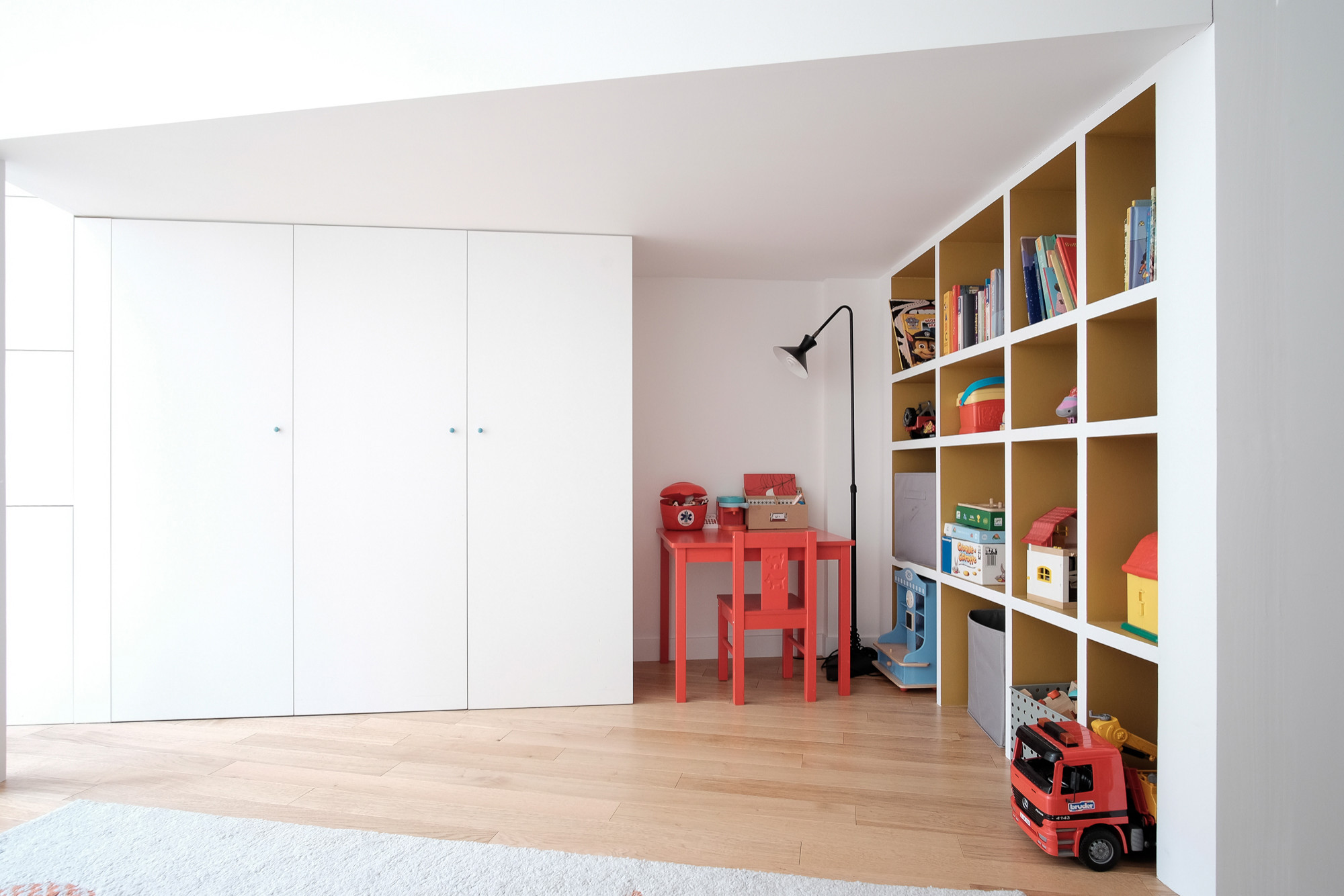 La poutre existante délimite deux zones distinctes pour chacun des enfants. Des poignées en céramique jaune et bleue permettent de différencier encore mieux les deux zones.