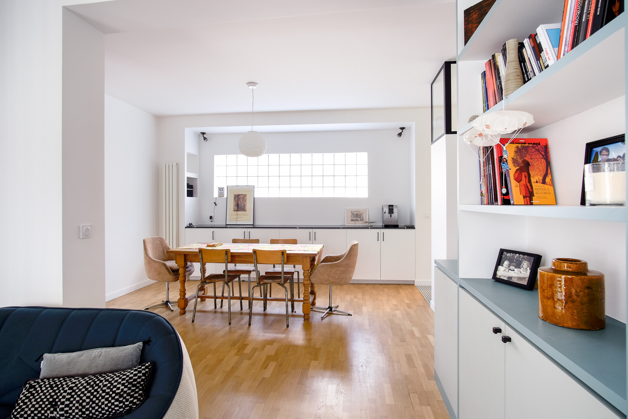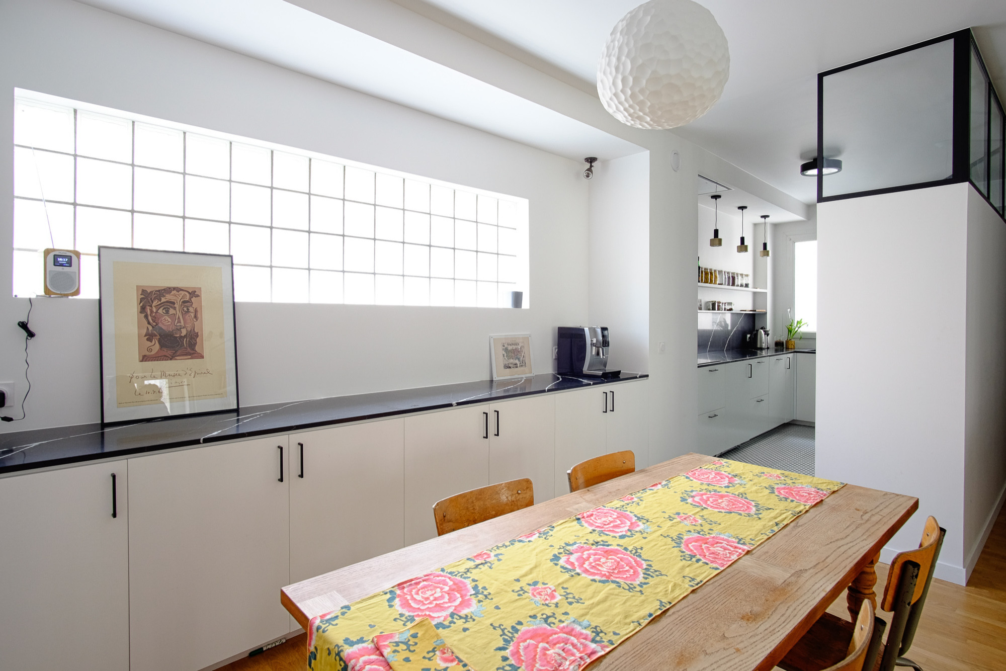 Un grand linéaire réalisé sur mesure en medium peint se prolonge jusque dans la cuisine. Celui-ci se pare d’un élégant plan de travail en quartz noir. Une retombée de faux plafond a été créée pour encadrer les briques de verre et former une continuité visuelle entre les espaces cuisine et salle à manger. Ici, le couple a misé sur une table en bois et des chaises vintage, afin de créer une ambiance éclectique empreinte d’une touche sixties.