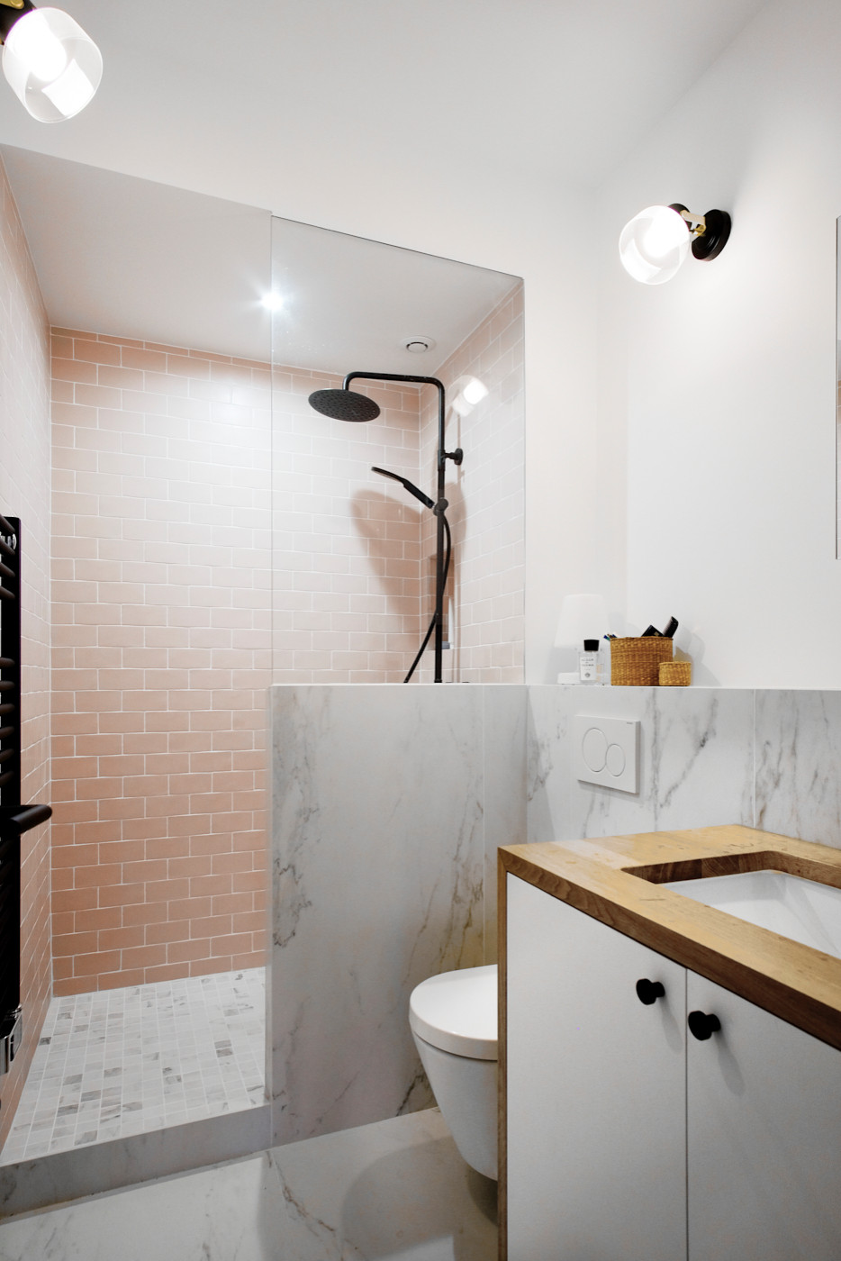 La salle de douche parentale mêle marbre blanc et carrelage rose nude pour créer une ambiance douce, associés à des éléments noirs — colonne de douche, robinetterie, sèche-serviettes ou encore poignées de placards — qui modernisent l’ensemble.