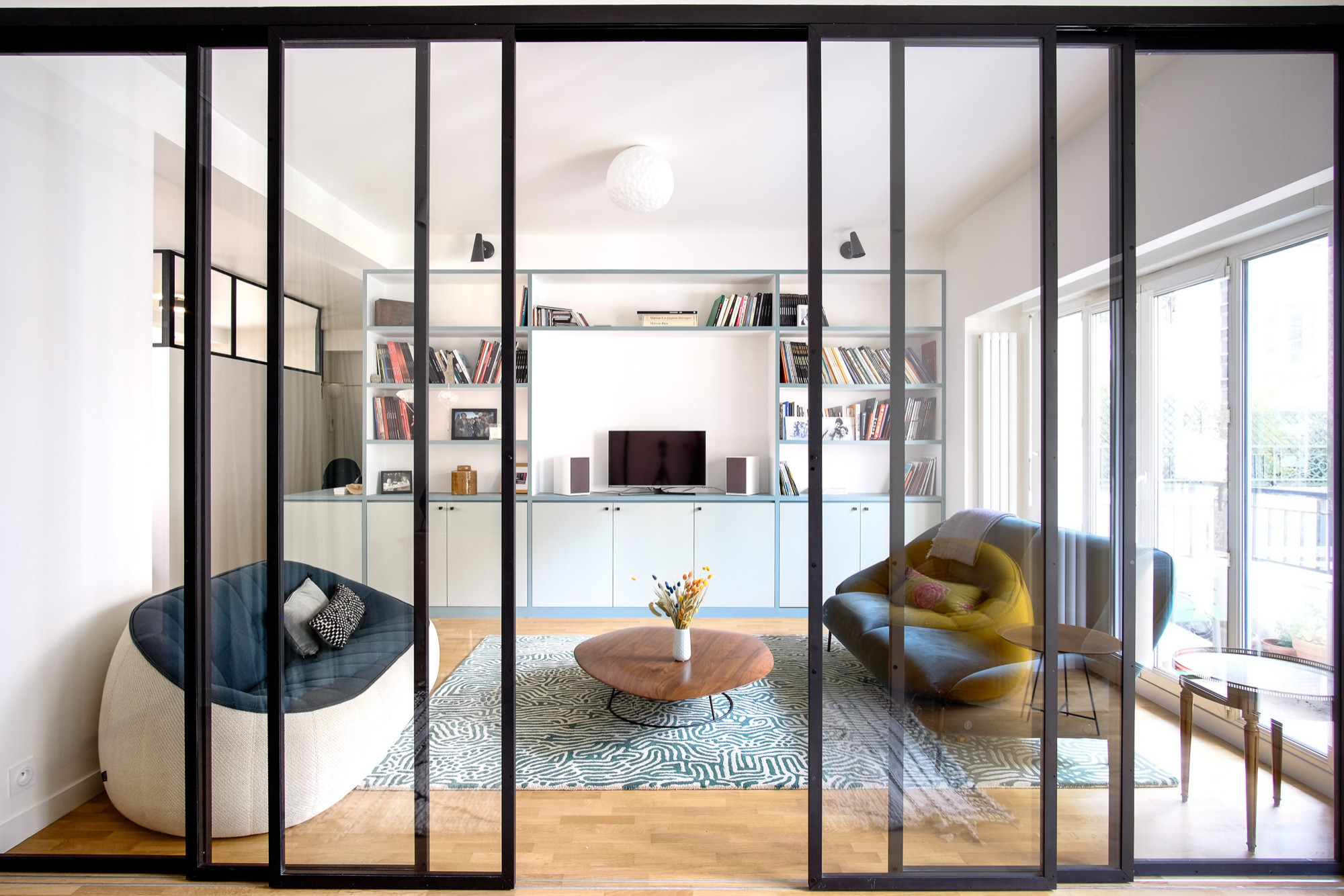 Après. Les cloisons de l’ancien espace bureau ont été déposées pour intégrer de grandes portes coulissantes vitrées en acier. Cette pièce multifonction fait aujourd’hui office de bureau et de chambre d’amis.