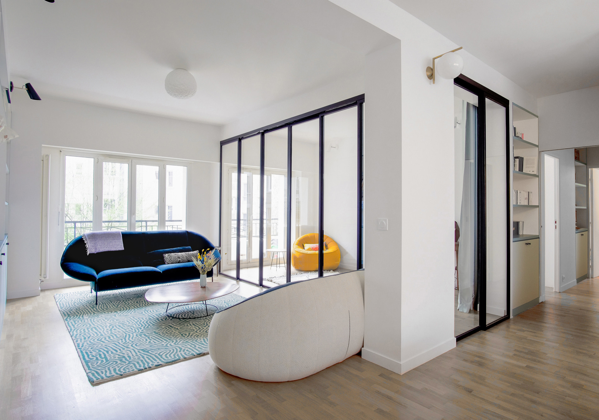 L’appartement disposait à l’origine de trois chambres et d’un double séjour. « Sur le plan, on constate qu’une partie de l’appartement, côté salle à manger, ne dispose pas de fenêtre mais de briques de verre. Il y avait donc un problème de luminosité à résoudre », commente l’architecte d’intérieur.