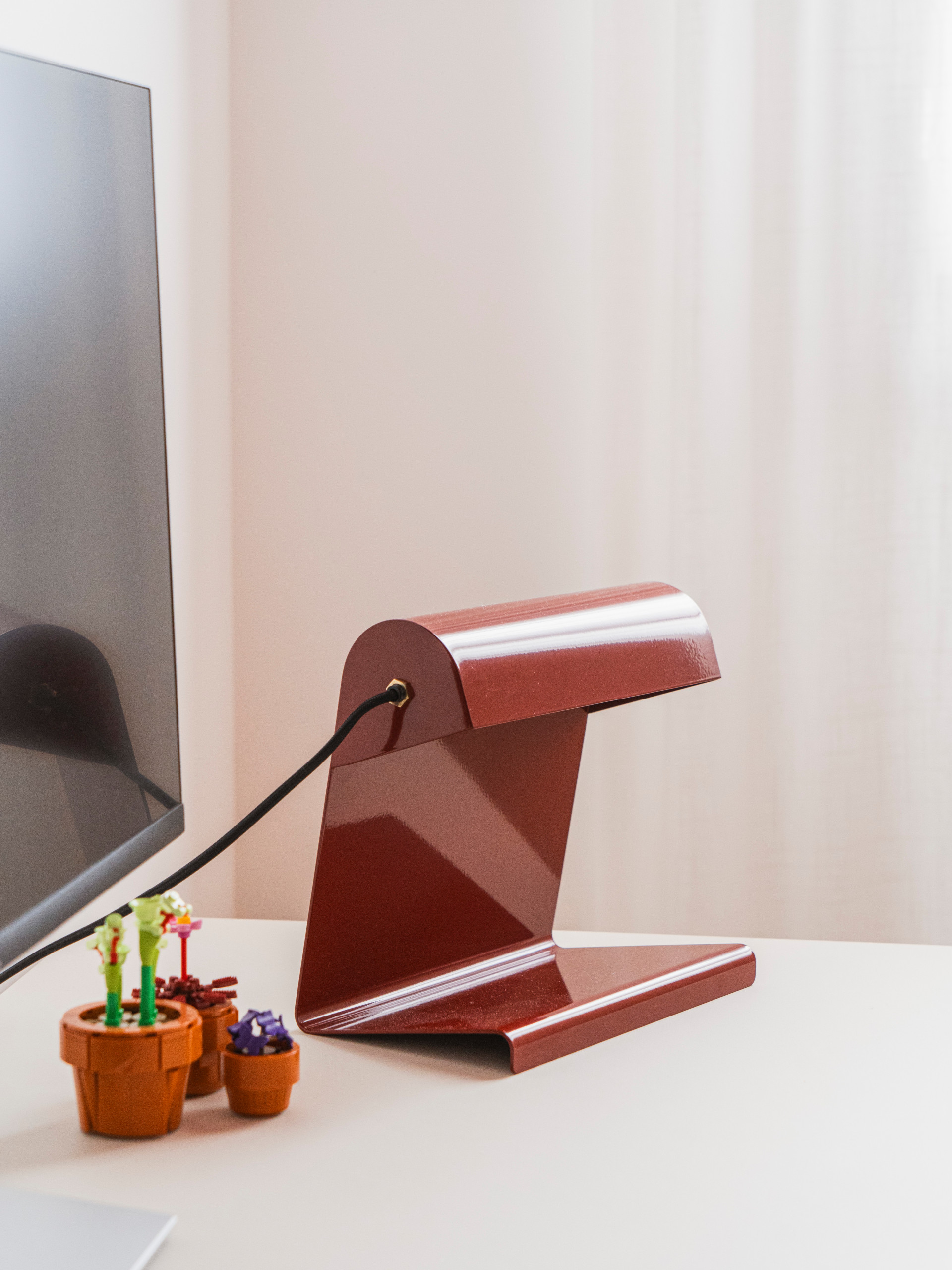 La lampe choisie pour le bureau renforce la touche vitaminée et design de cet espace moderne.