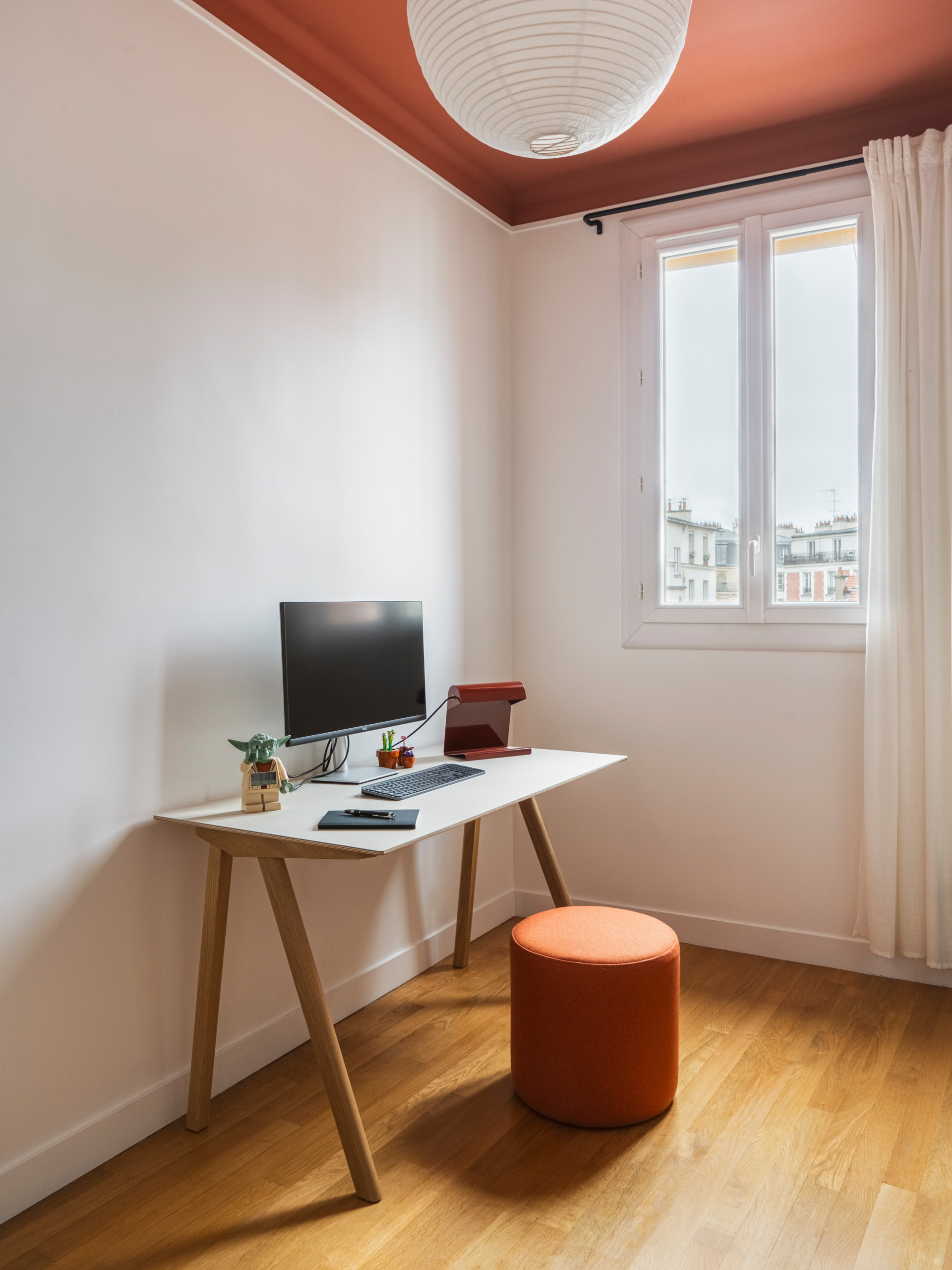 Dans ce bureau clair et épuré, pourvu d’un pupitre blanc, dont les jambages obliques et longilignes en compas écartés rappellent légèrement ceux de la table du salon, le pouf fait écho au plafond par sa note orangée et vive. Le choix d’ambiance valorise la clarté, l’épure et la chaleur.