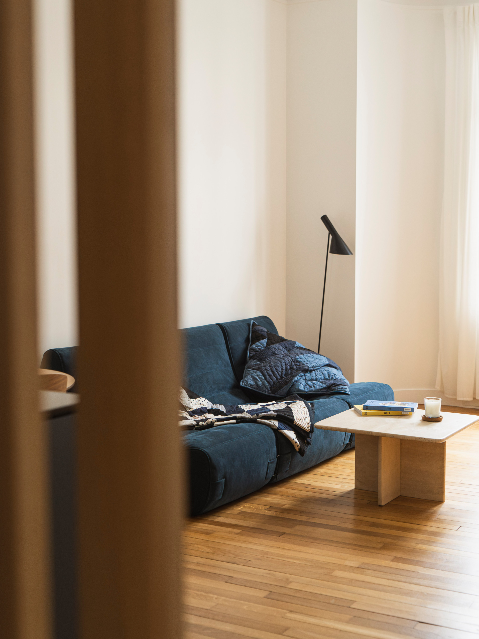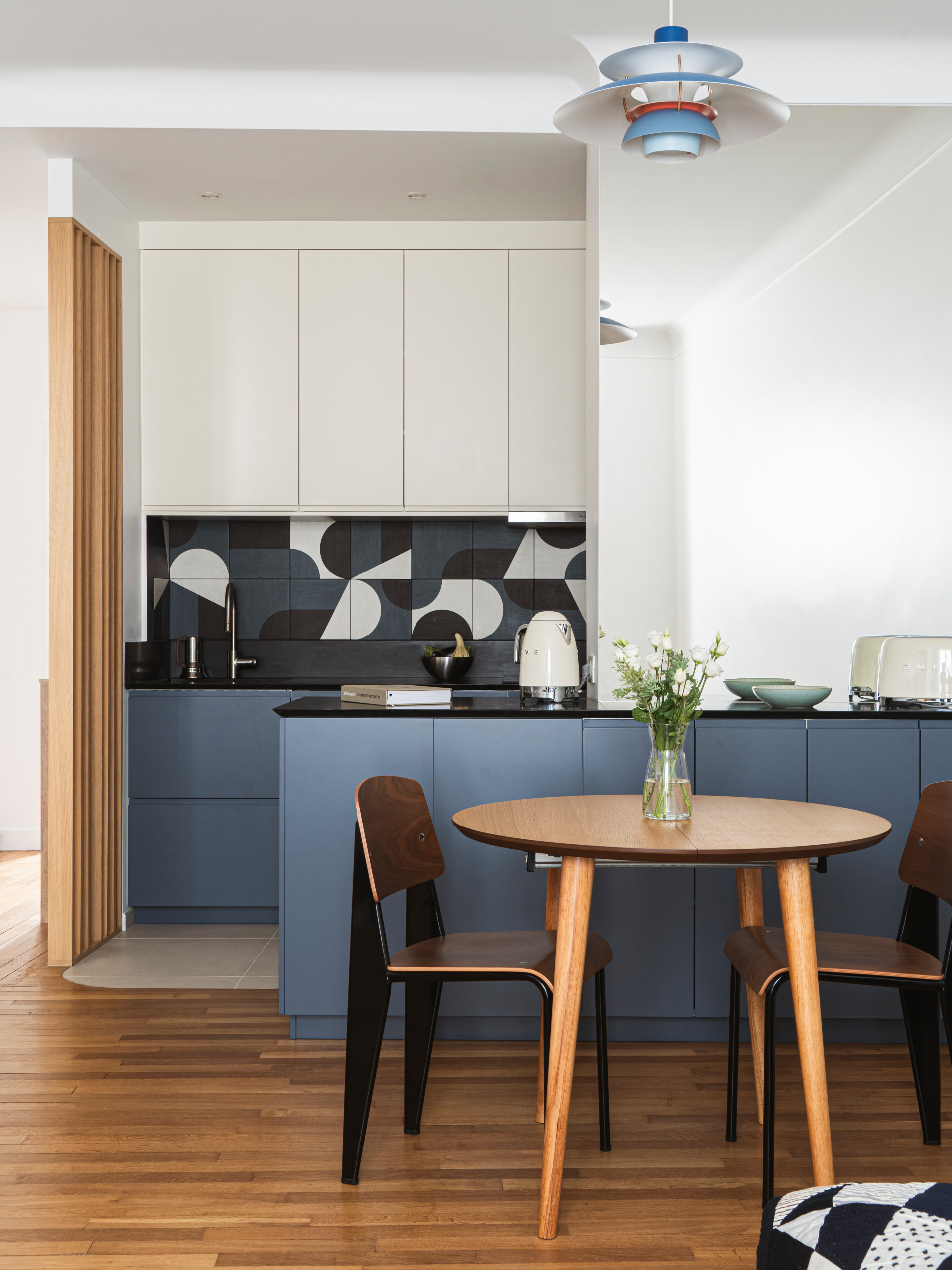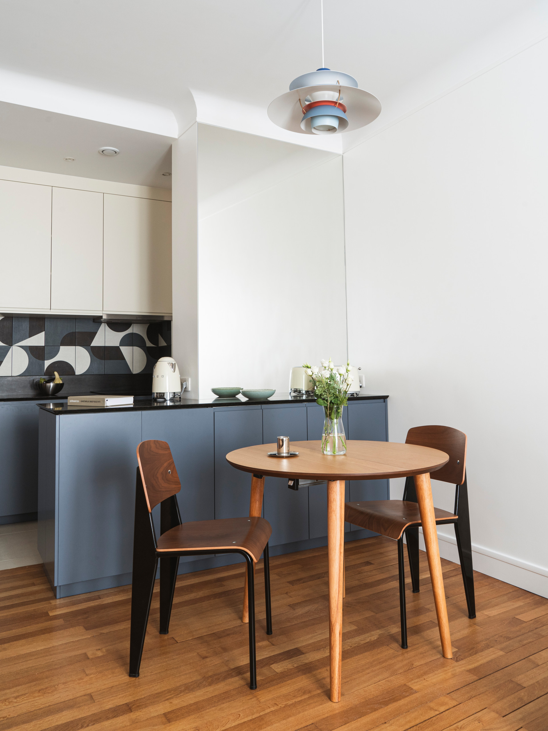 La salle en manger s’articule autour de meubles simples aux lignes très marquées et droites, avec la table ronde aux pieds en jambes de compas, s’harmonisant ainsi aux géométries de l’appartement. Le bois s’allie bien aux notes bleu sombre et au parquet, et réchauffe le visuel.