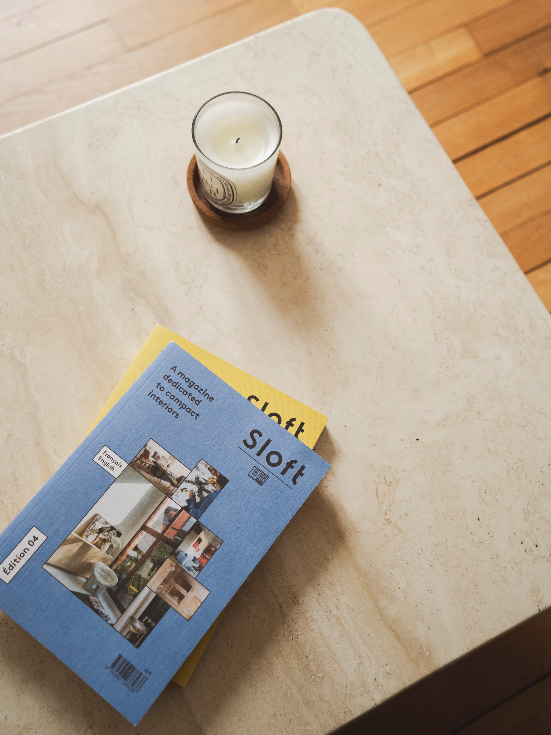 Voici la table basse vue de près. Avec son plateau carré et son pied en croix, elle s’inscrit bien dans les jeux de lignes de l’appartement. « Elle est en travertin, ils hésitaient à la garder, je leur ai conseillé de le faire. Ils avaient des éléments de décoration assez jolis », explique Thomas.