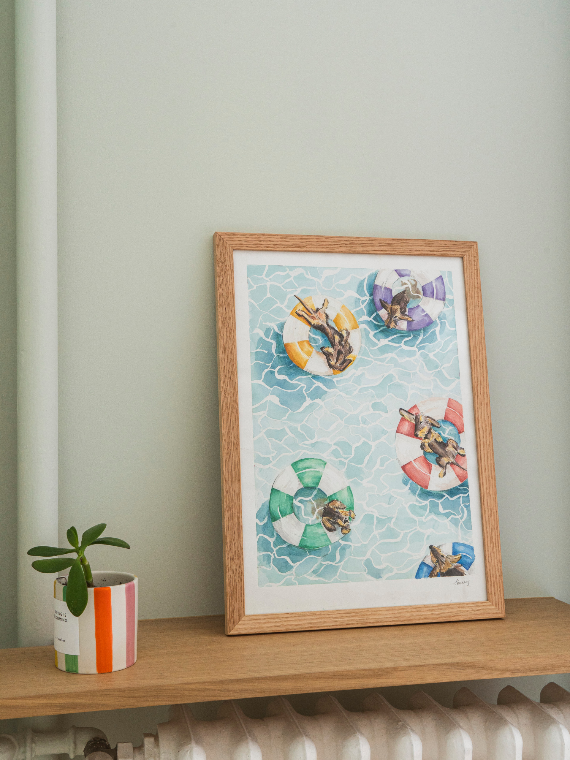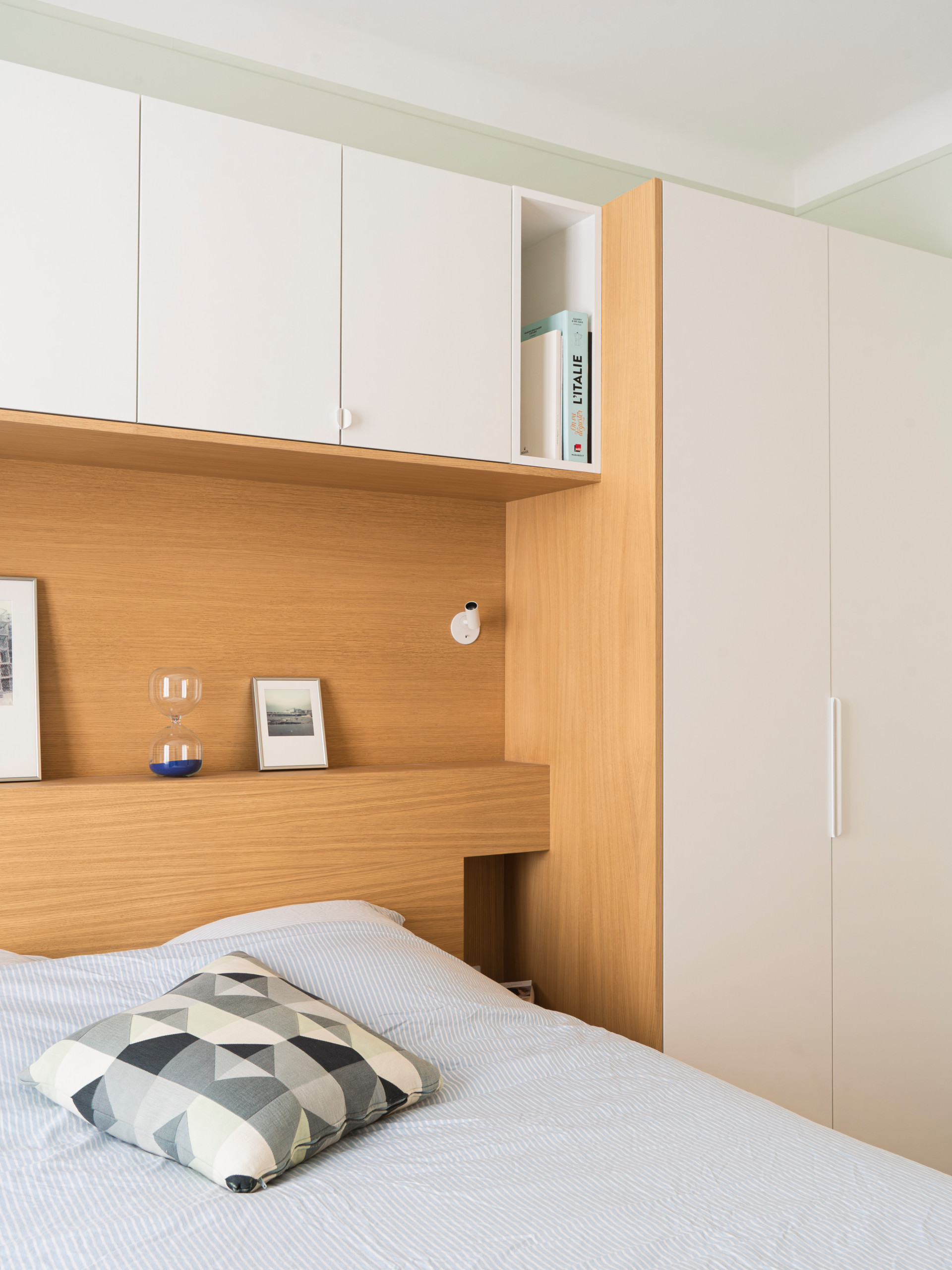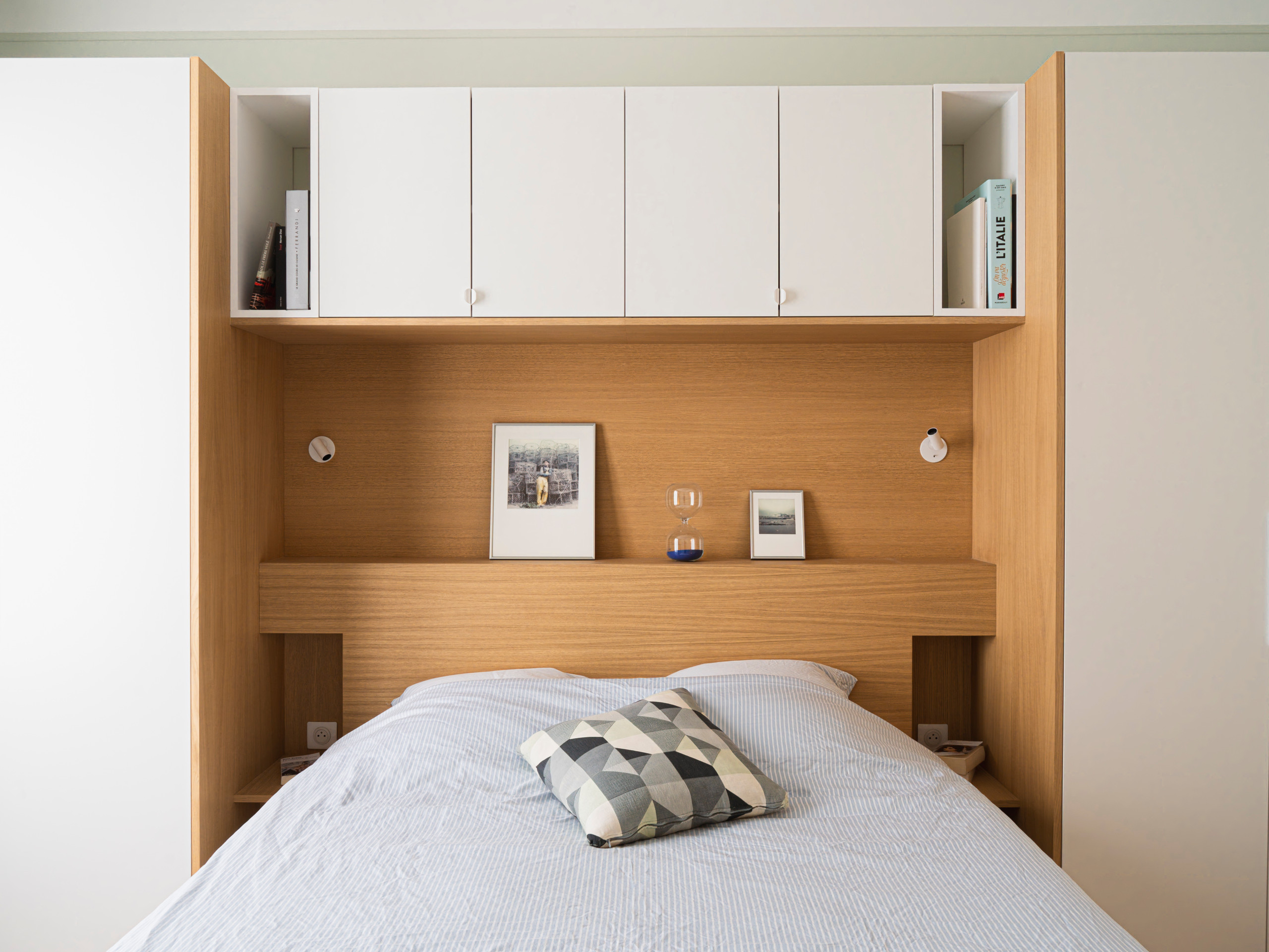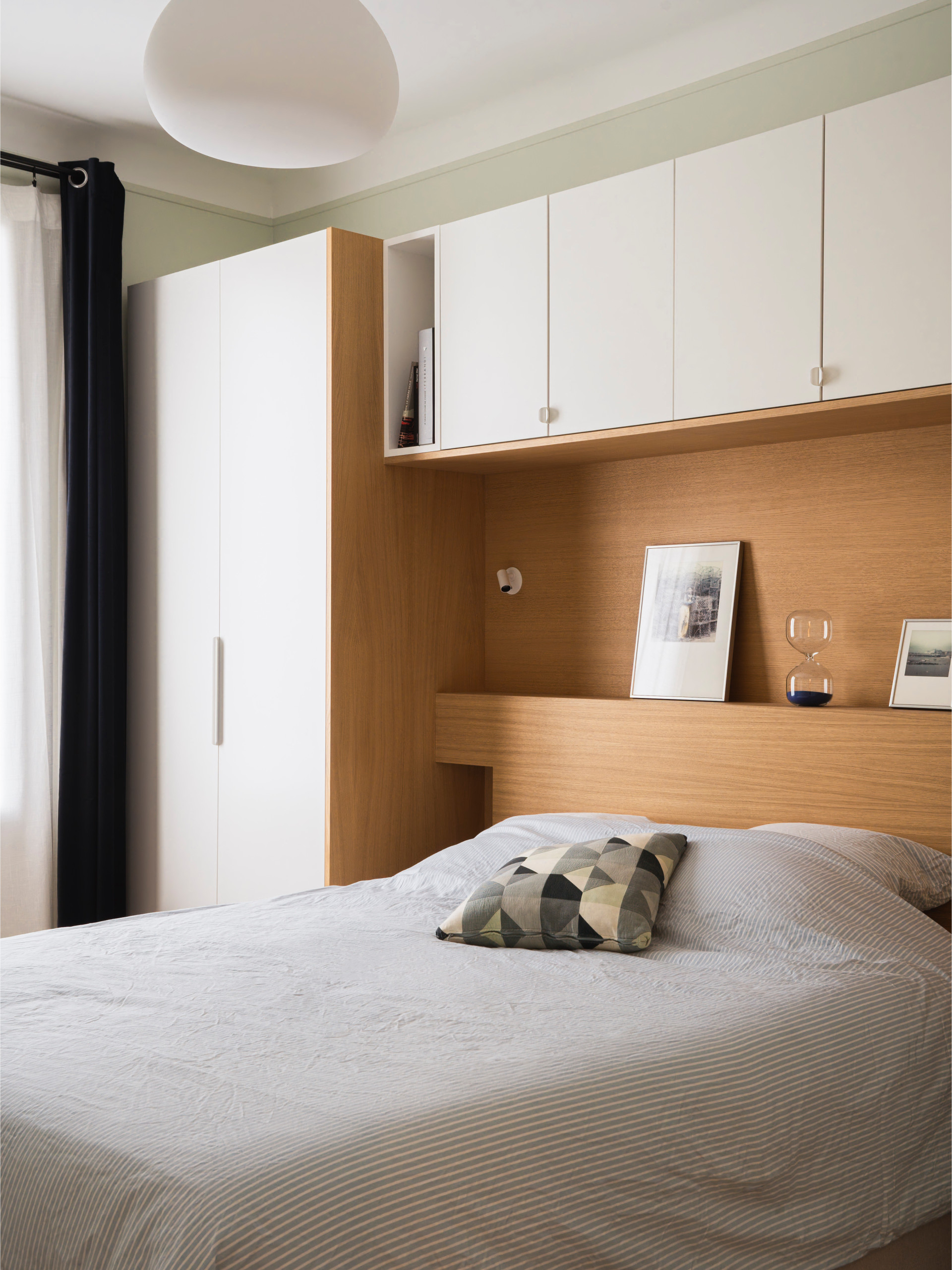 « La tête et le pont de lit sont sur mesure », précise Maximilien. « Du “semi-mesure” : on prend des caissons Ikea, que l’on “habille” ensuite comme on le souhaite ». Cette utilisation du « hack Ikea » – où l’on combine des caissons de l’enseigne à des façades ou autres ajouts personnalisés – permet un aménagement précis et complet pour un budget raisonnable. Dans cet environnement simple et fluide, le coussin placé par les propriétaires crée un écho à la décoration particulière des autres pièces.