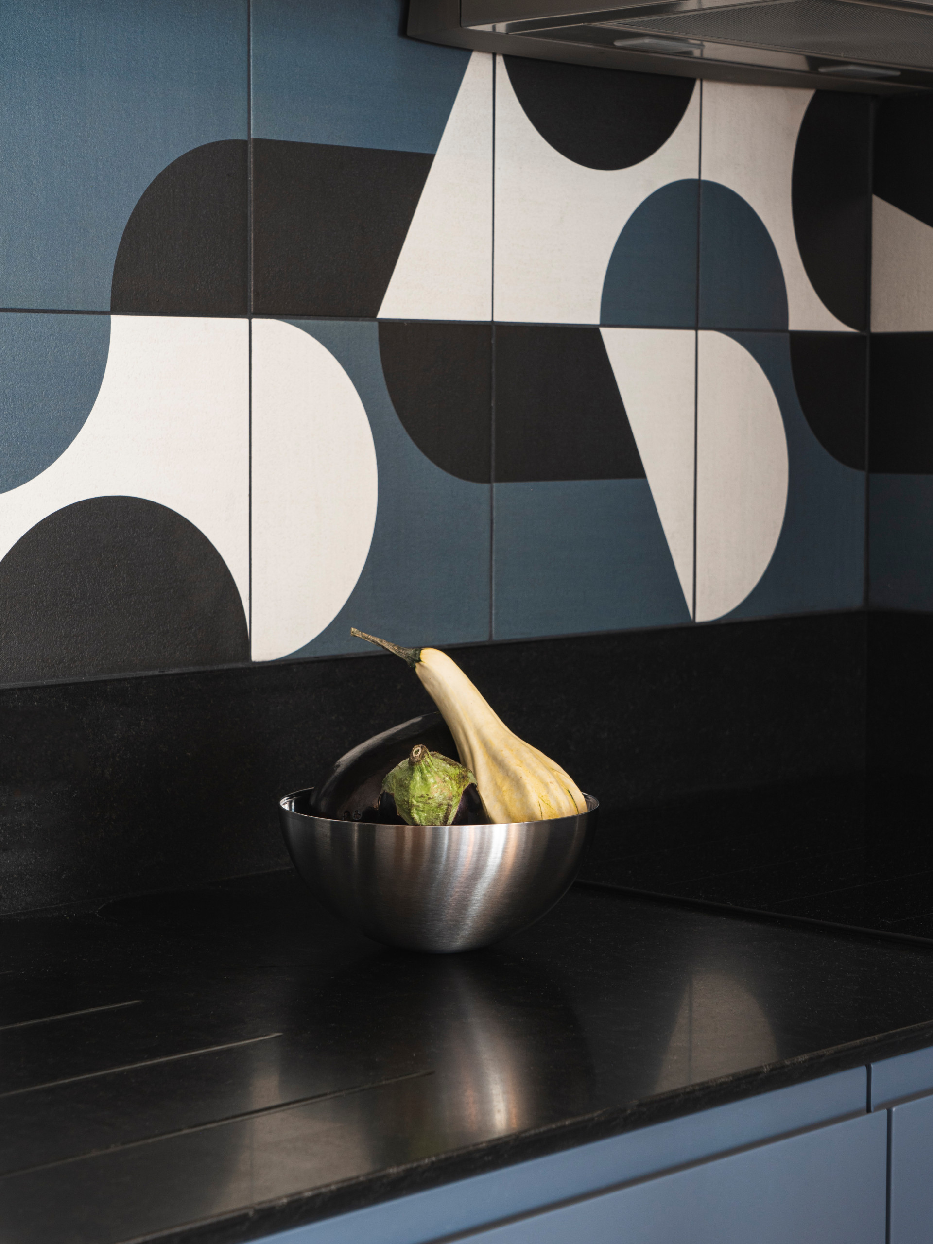 Voici le détail du carrelage de la cuisine, qui avait pour inspiration de départ le textile quilt montré par les clients. La crédence comporte huit carreaux différents par boîte. « Ensuite, on dessine avec, on crée son propre motif », explique Thomas. « Ce carrelage, c’est le point focal de l’appartement ».