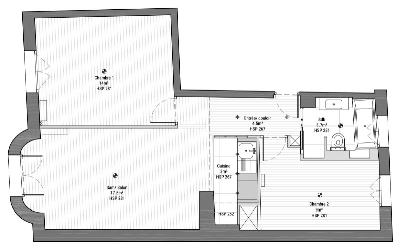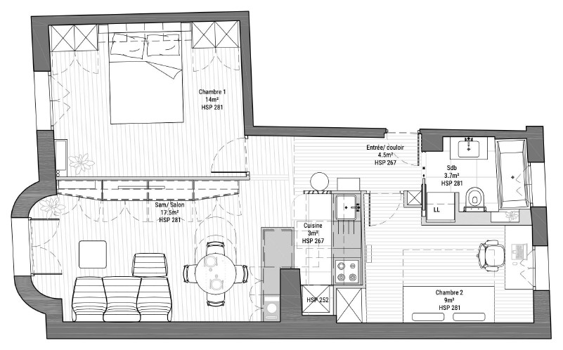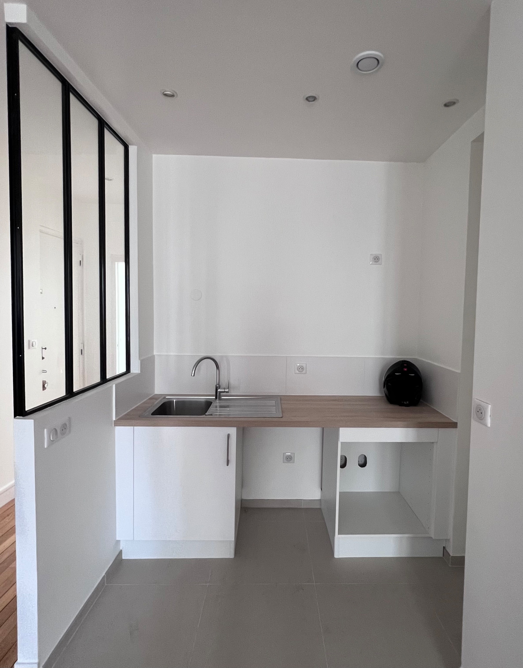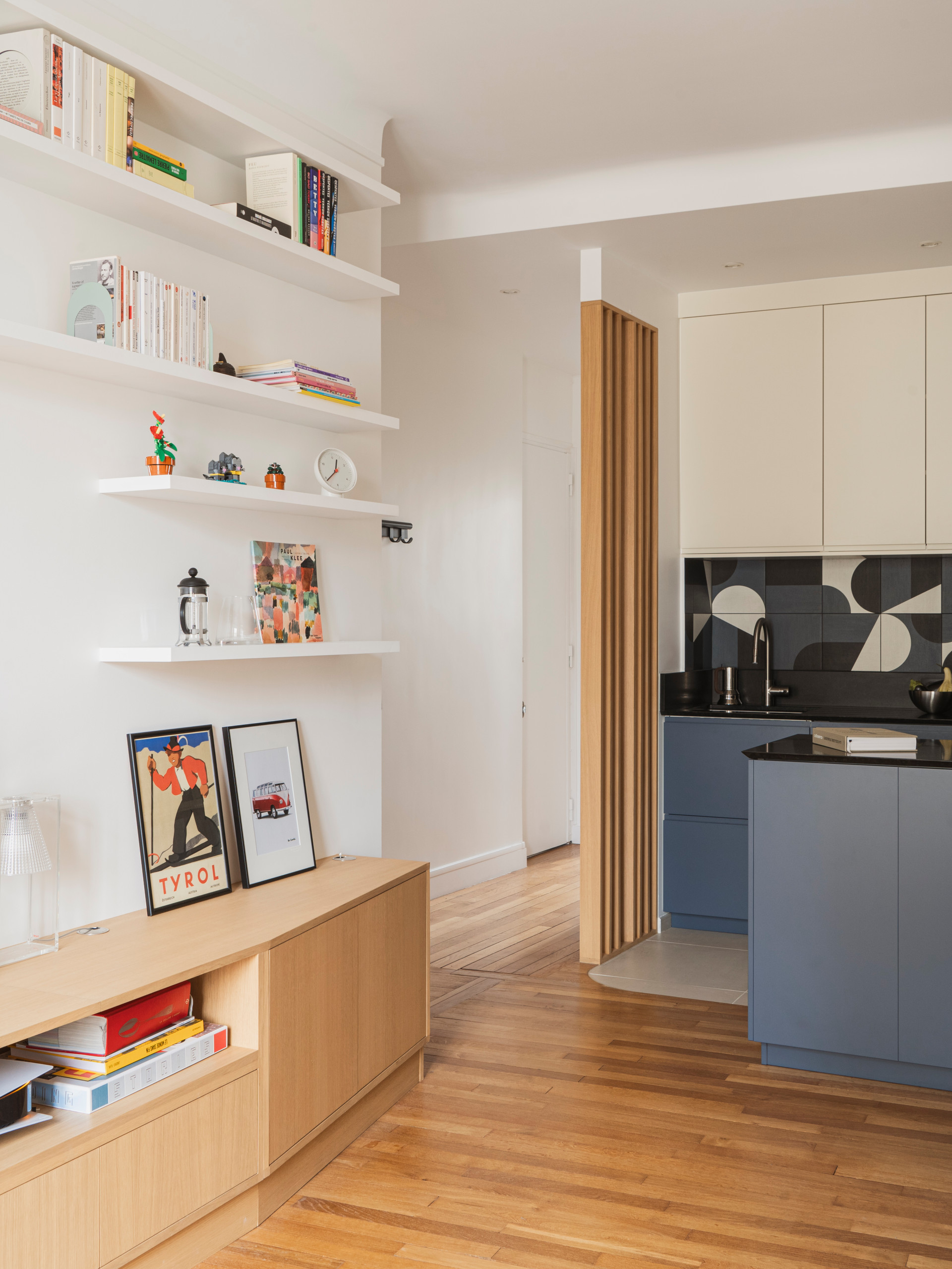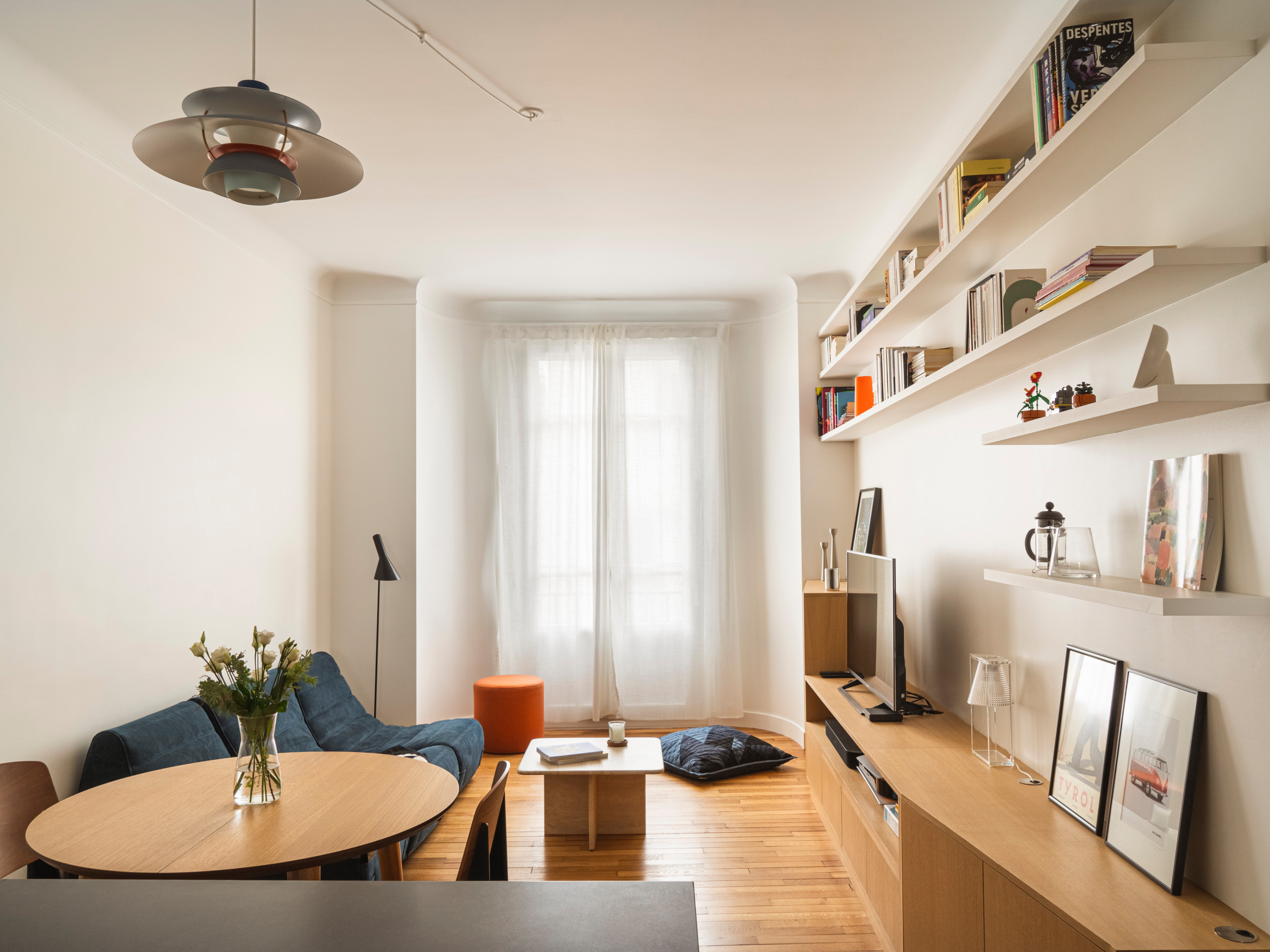 Après. Voici comment se présente l’appartement retravaillé : une chambre pour deux, une salle de bains, un bureau, et surtout un triptyque cuisine ouverte/salle à manger/séjour qui constitue la part centrale du logement. « L’enjeu », explique Thomas en évoquant les souhaits des jeunes propriétaires, « c’était de donner de la vie, d’obtenir un lieu qui leur ressemble, avec un cachet ; il fallait créer des rangements, une cuisine avec plus de place, optimiser la salle de bains et la rendre plus charmante, aménager le salon… ».