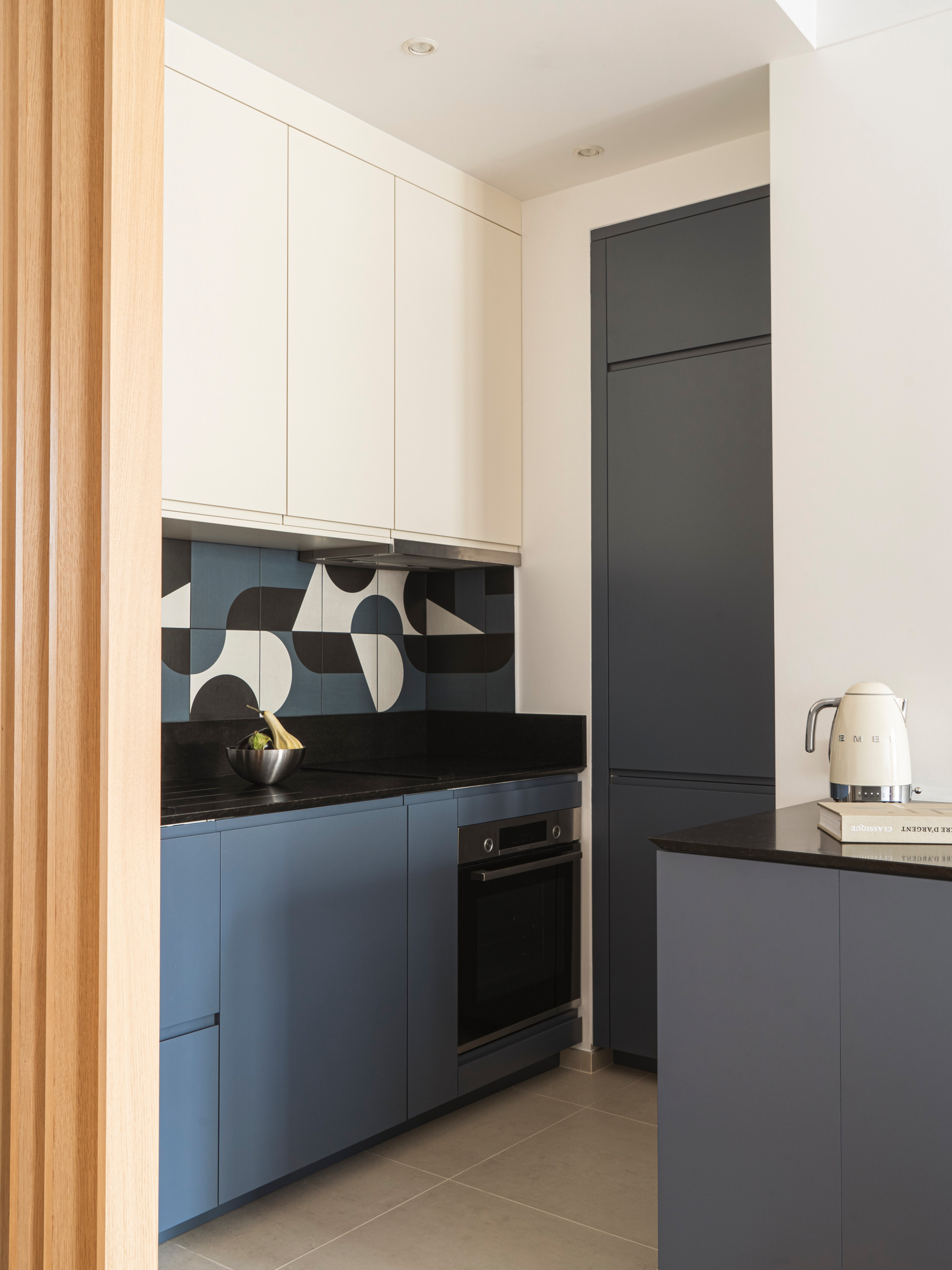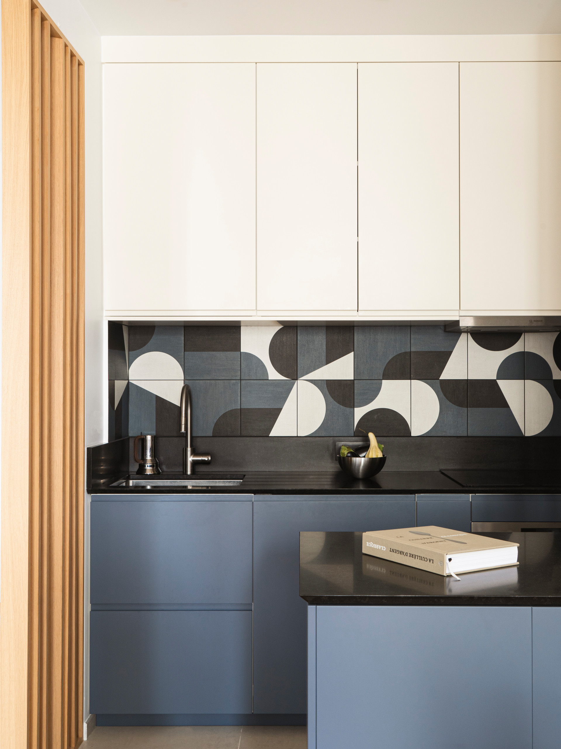 La cuisine s’organise autour de cette crédence bleu sombre, blanc et noir, dont les éléments environnants reprennent les trois tonalités. En effet, les façades sont assorties à la crédence. Le choix de placer les placards blancs en hauteur ouvre le regard et empêche la cuisine de paraître trop engoncée.