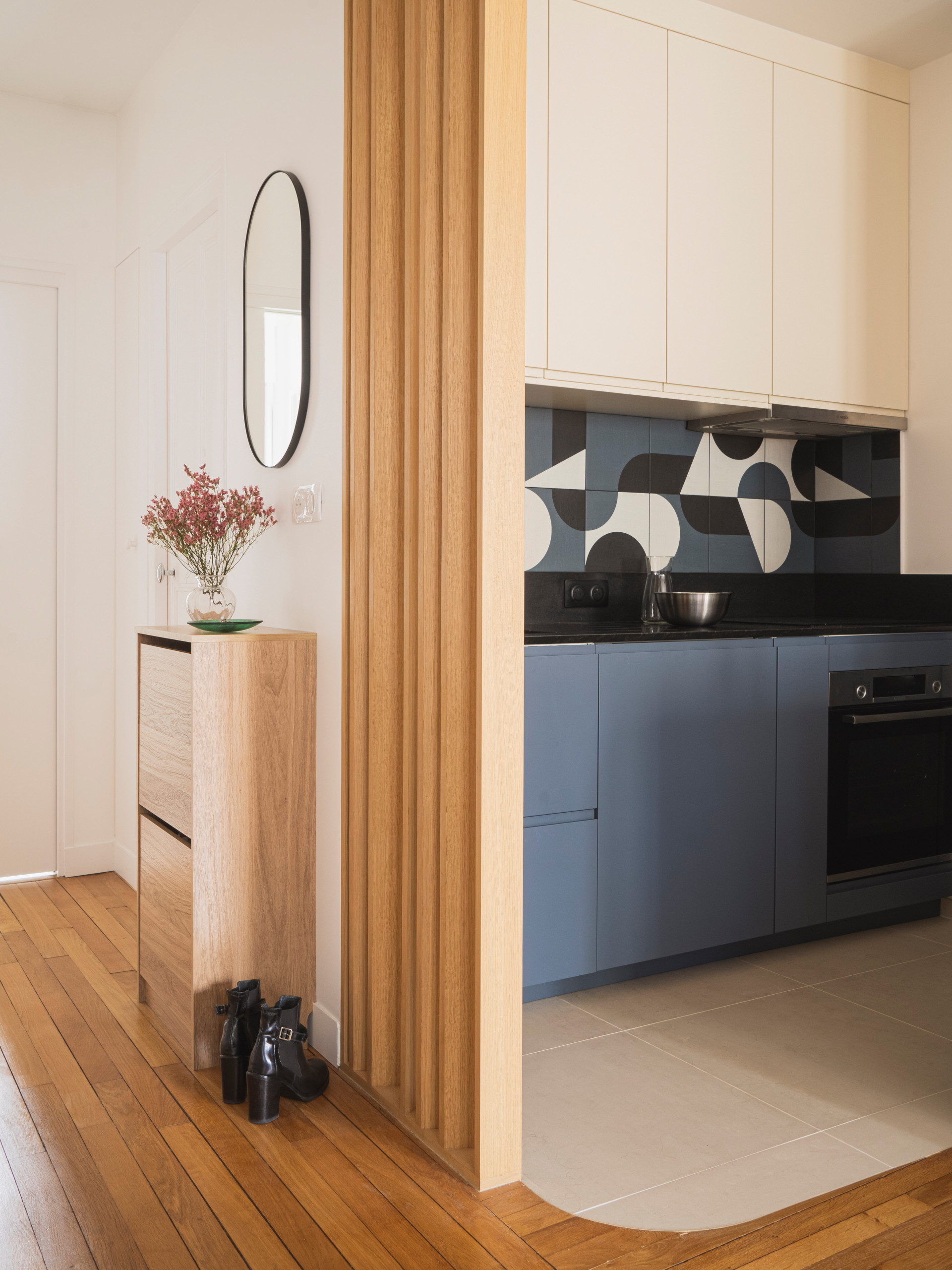 Après. Voici l’entrée vue de l’intérieur, selon l’angle opposé. On relève d’emblée l’importance des perpendicularités, des courbes et des géométries dans l’appartement. D’une part, des lignes très droites, au sol avec les lattes de parquet, et à la verticale avec le meuble sur mesure accueillant les chaussures. D’autre part, des arrondis, des ovales et des quarts de cercle animent le champ de vision. « Ces lignes circulaires, comme le miroir ovale de l’entrée, adoucissent les angles. Pour le dessin du carrelage au sol, on a ajouté des fragments redessinés pour créer un arrondi », raconte Thomas.