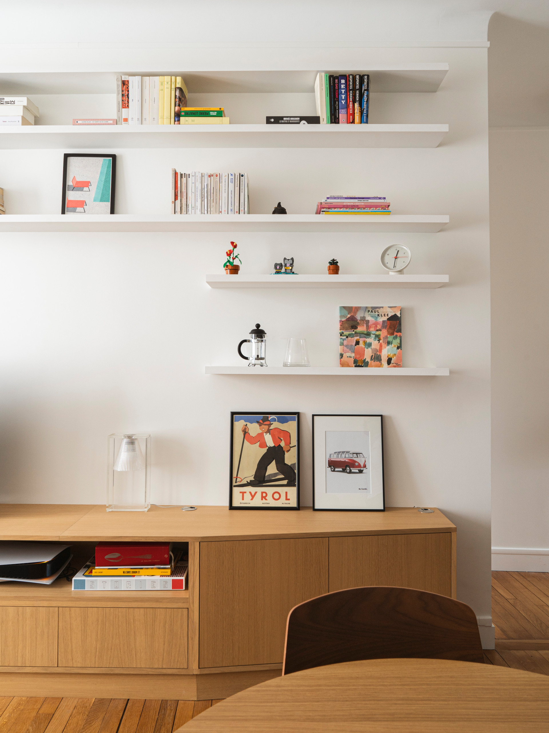 Nous remarquons en haut à droite de l’angle du mur, marquant la jonction avec le plafond, un léger arrondi. Cette forme, d’origine, contribue au cachet de l’appartement et a été préservée. « Dans plusieurs endroits, comme la chambre et le bureau, nous avons mis en valeur ces arrondis, nous avons peint de façon à renforcer leur dessin », raconte Thomas. « Le mobilier ici est sur mesure, dans deux tonalités, en MDF peint en blanc et en MDF plaqué chêne en bas », précise Maximilien.