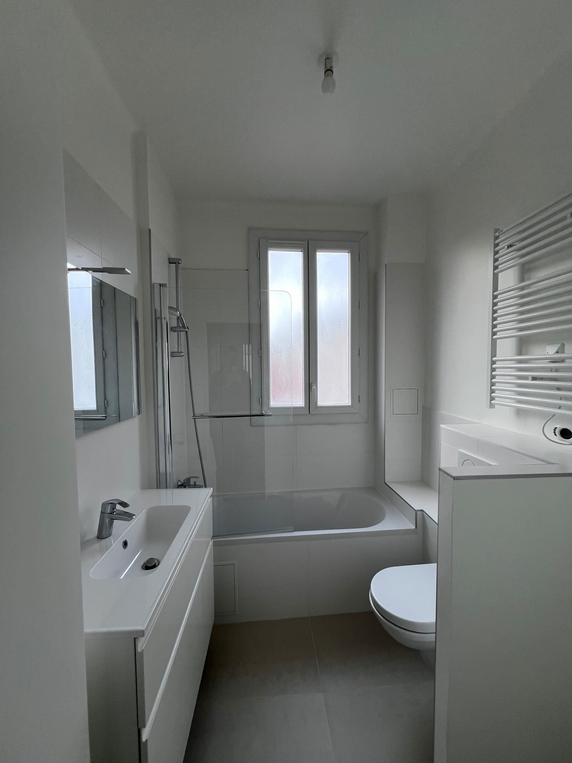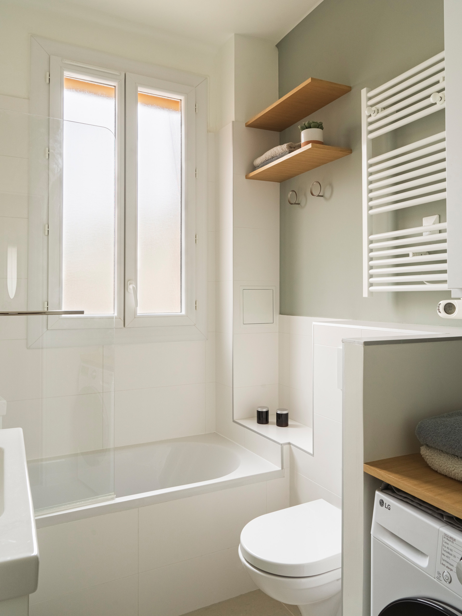 Après. Comme dans la chambre, le choix d’une couleur claire et douce, ici vert amande, a été préféré à l’incolore. Maximilien précise : « Nous avons placé dans la salle de bains deux étagères en MDF plaqué chêne et une planche sur la machine à laver, le tout sur mesure ». Cet aménagement sobre apporte cependant à la fois de la praticité sur le plan fonctionnel et de la chaleur sur le plan esthétique.