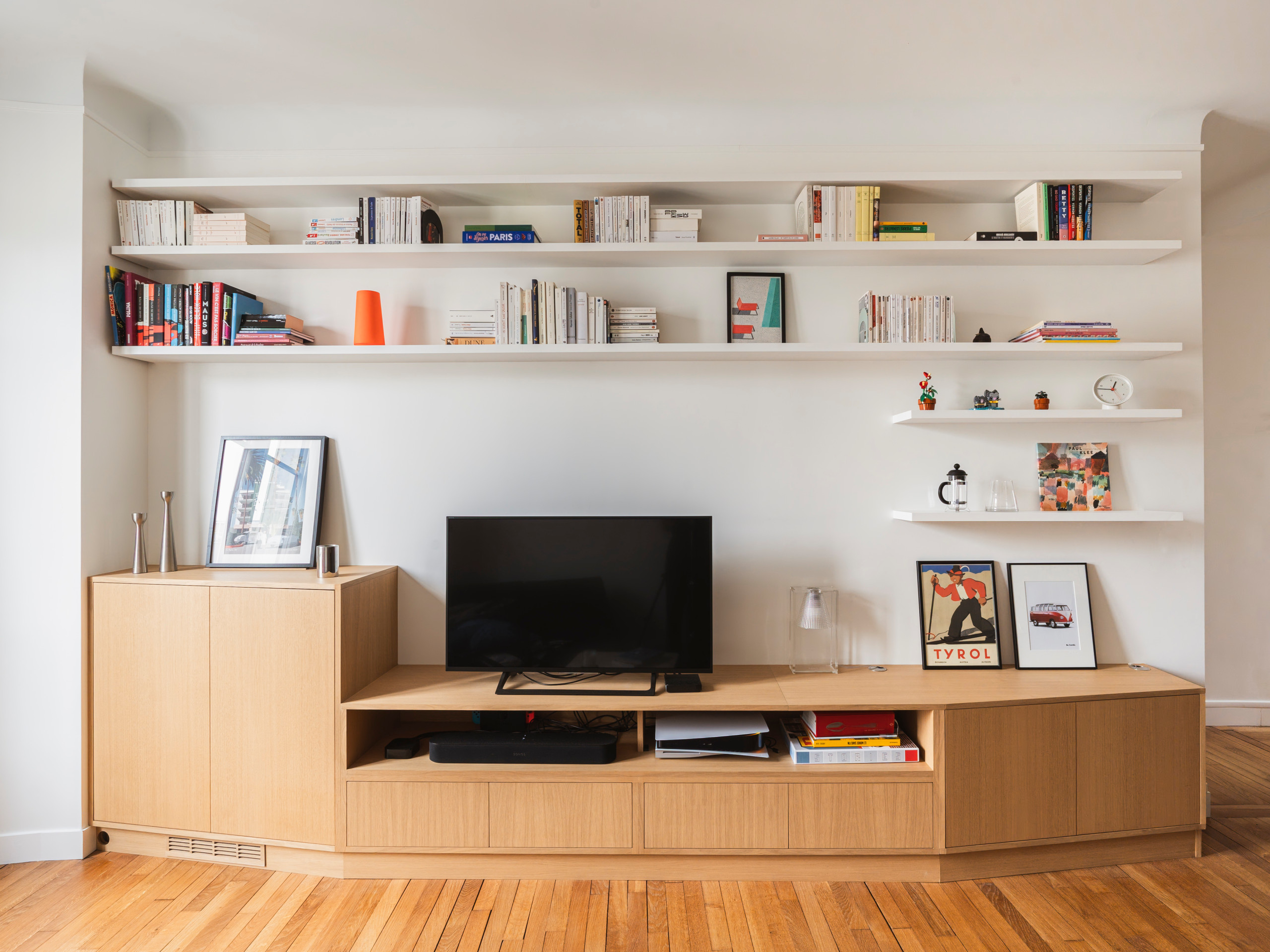 Concernant le meuble de séjour, « nous l’avons dessiné en cassant les angles, pour fluidifier la circulation », se souvient Thomas. Les trous que l’on entrevoit à gauche près du sol correspondent au coffrage du radiateur, tandis que sous le téléviseur a été réservé un espace ouvert, souhaité par les clients afin d’y placer la PlayStation.