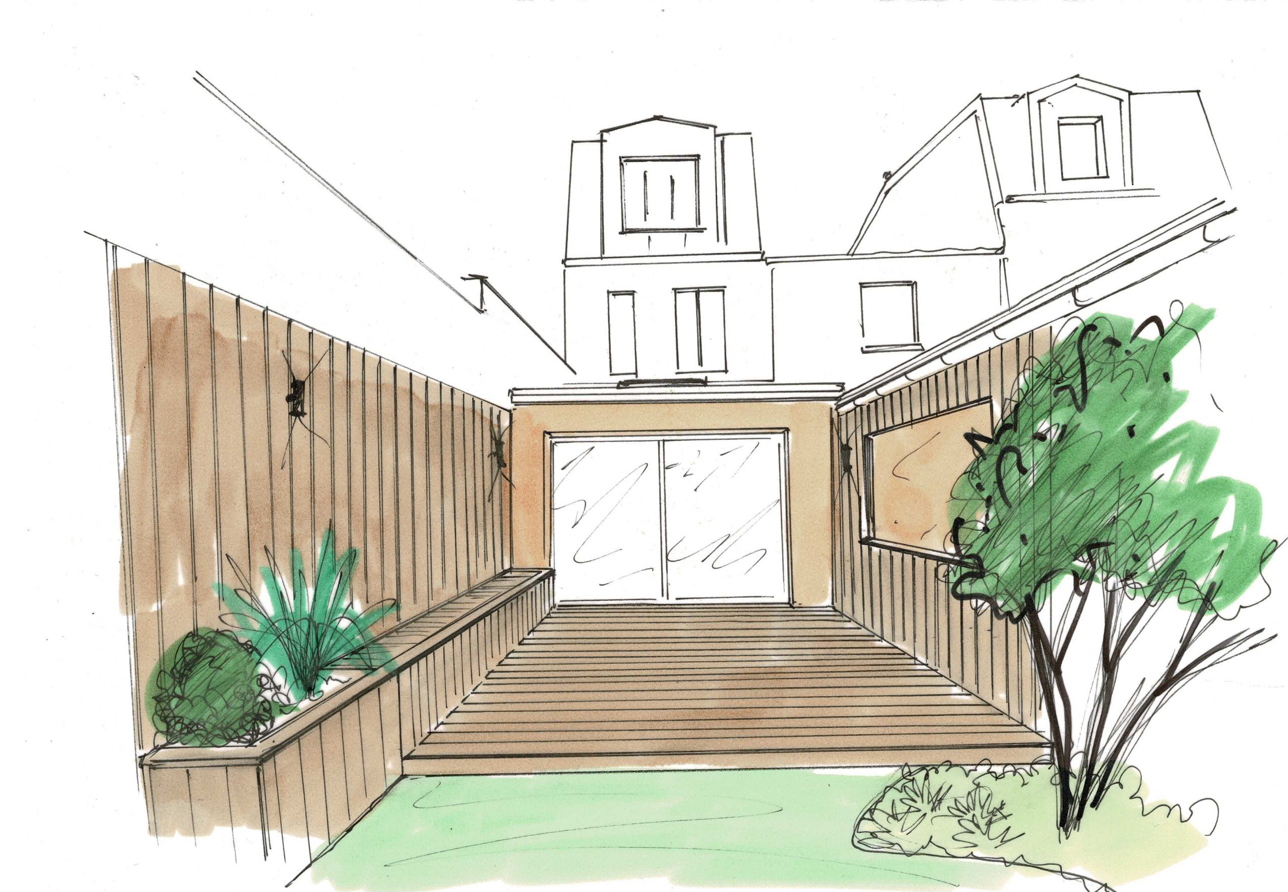 Lorsque cette famille a visité la maison pour la première fois, le petit jardin fleuri leur a paru charmant. Ils s’y sont pleinement projetés, imaginant un espace terrasse pour les repas et la détente, une pelouse, des fleurs et un petit potager. Ils souhaitaient également préserver la circulation pour desservir une dépendance au fond du jardin car ils envisageaient de la transformer en studio.