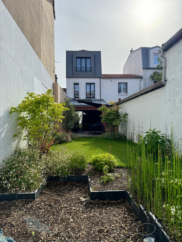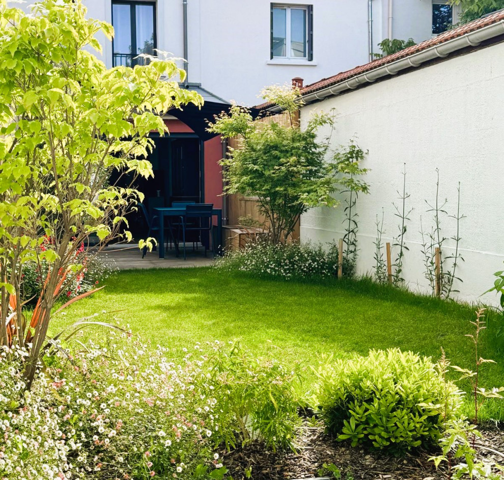 À Puteaux, ces trentenaires, parents d’un bébé, ont acquis une maisonnette dans un quartier résidentiel très dense. Après avoir fait rehausser et agrandir la maison sur le jardin, ils ont souhaité aménager la petite parcelle. Ayant repéré le profil du paysagiste Florian Préault sur Houzz, ils lui ont confié cette mission, qui revêt pour eux une importance toute particulière. « C’était leur première maison avec jardin et ils étaient très attachés à sa végétalisation. Ils m’ont laissé carte blanche car, très éprouvés par des mois de travaux, ils étaient un peu en panne d’idées », partage-t-il.