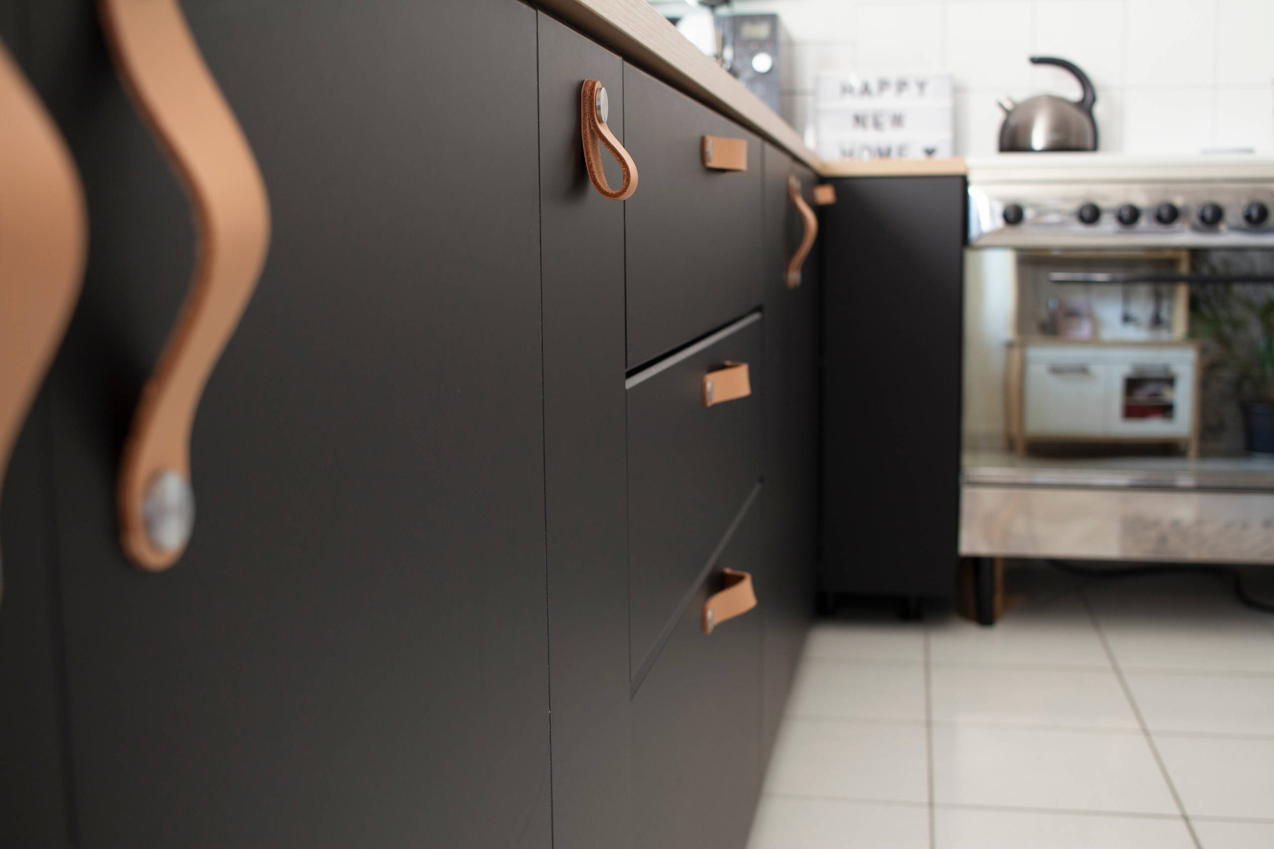 Elle a par ailleurs opté pour des finitions naturelles comme des poignées en cuir et des étagères en bois. Ces dernières ont été installées soigneusement avec des trous dans les joints plutôt que sur les carreaux. Elles supportent les bocaux dans lesquels Estelle stocke la nourriture qu’elle achète en vrac pour limiter l’usage de sacs plastique : du chocolat en poudre, de la farine, du sucre, des céréales…