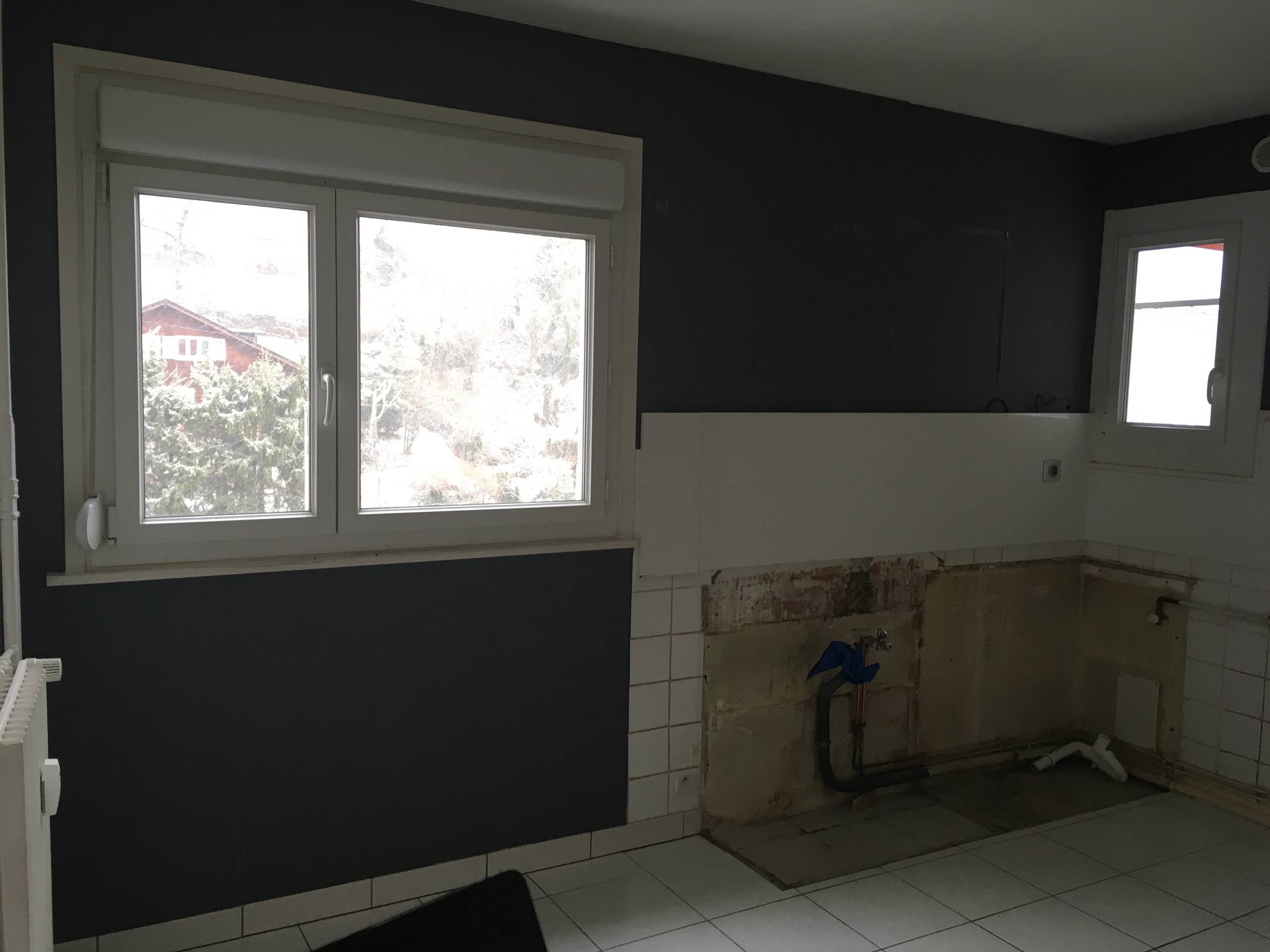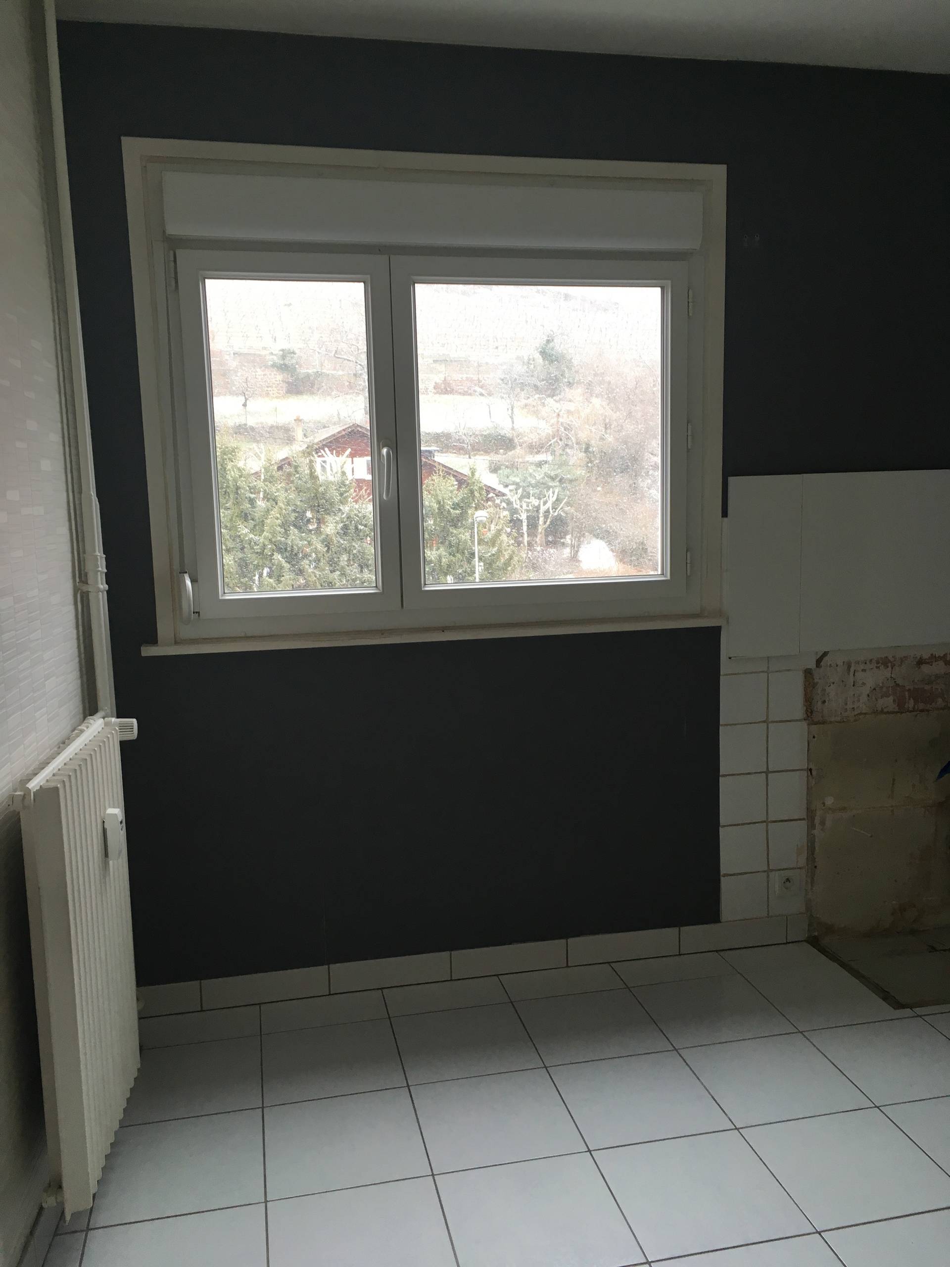 Avant. Les anciens locataires avaient un petit linéaire et des murs noirs. Estelle a préféré un grand plan de travail et davantage de luminosité.