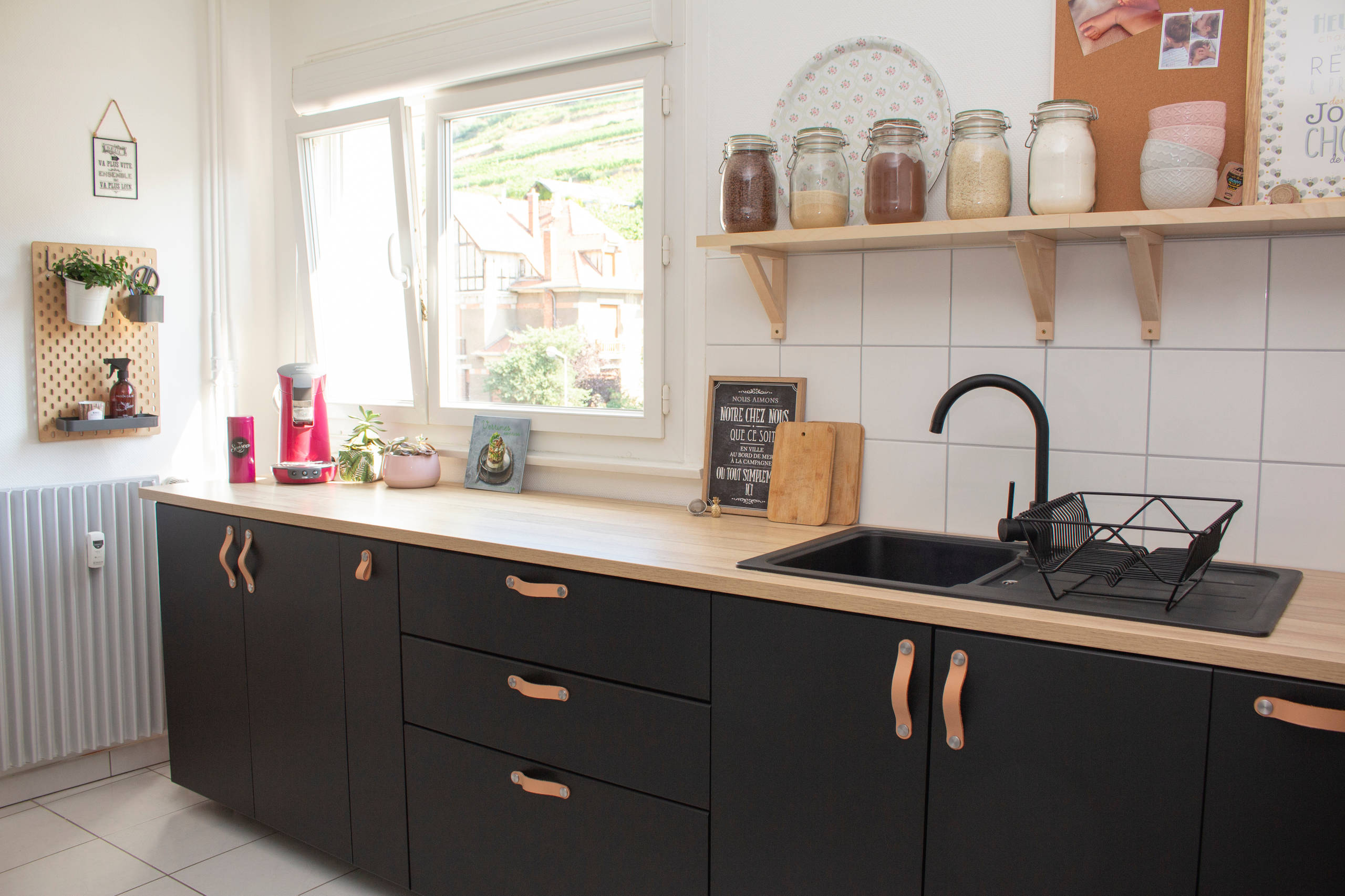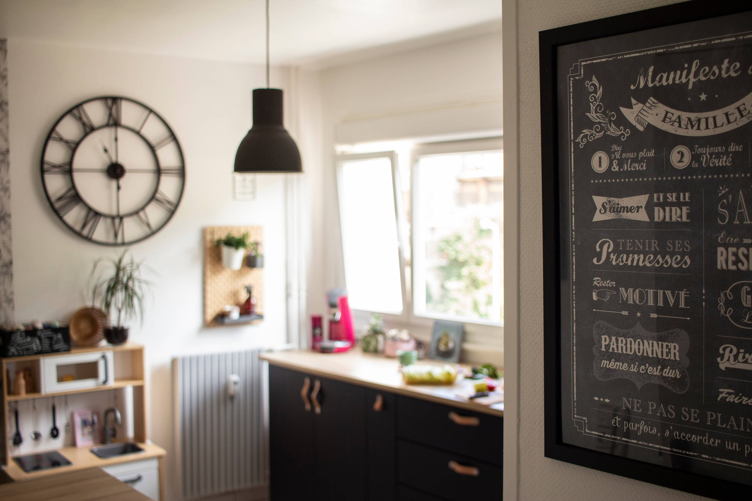 Question style, Estelle affectionne depuis l’adolescence l’univers industriel et trouvait qu’il se prêtait particulièrement à une cuisine. Ce qui lui a permis de recycler quelques objets en sa possession : une grande horloge achetée chez But il y a quelques années, une suspension noire et des tableaux style ardoise de bistrot.