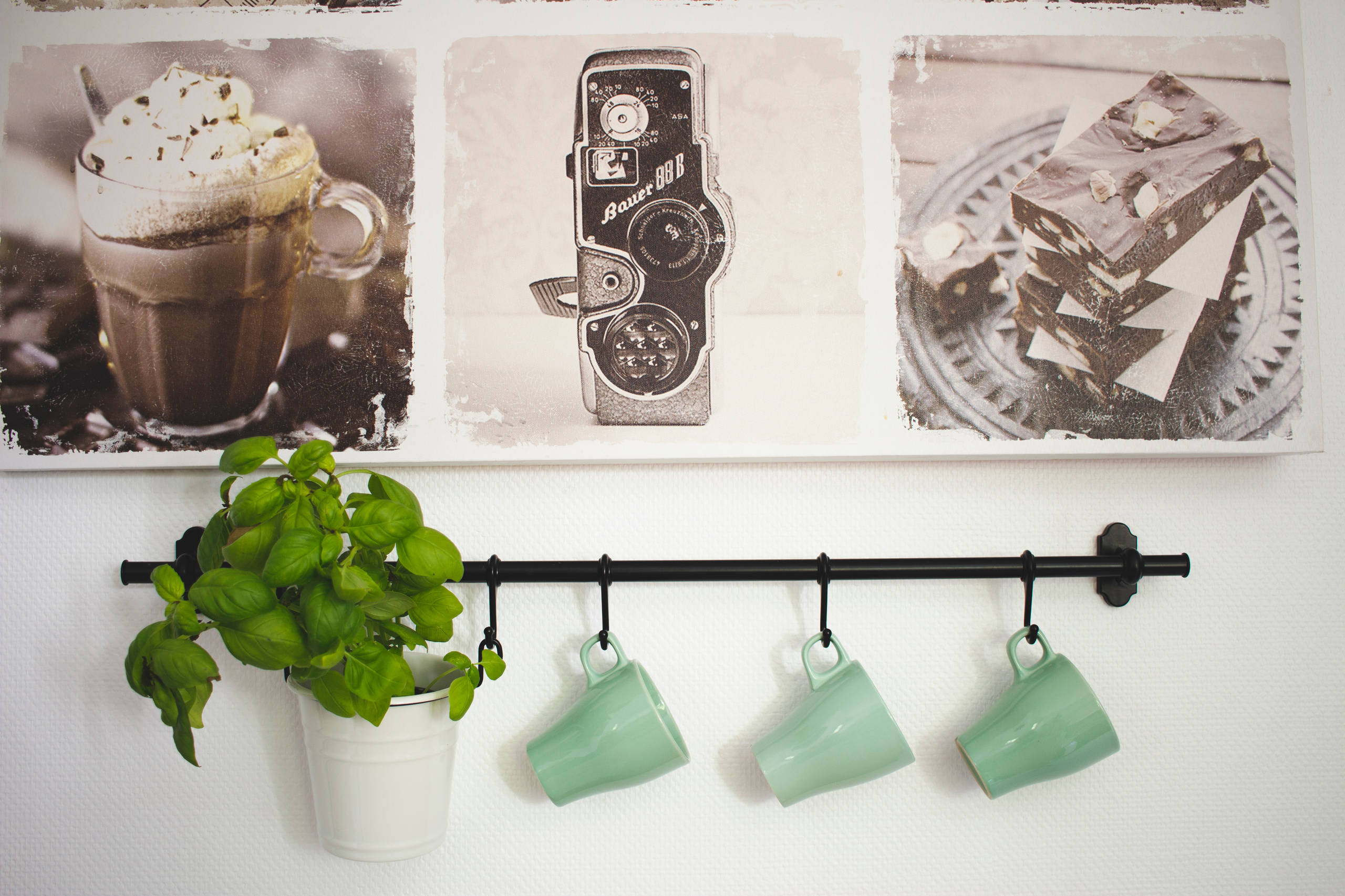 Au dessus de cette table à manger, une tringle habituellement utilisée pour suspendre les ustensiles sur les crédences, accueille des tasses céladon et un basilic en pot.