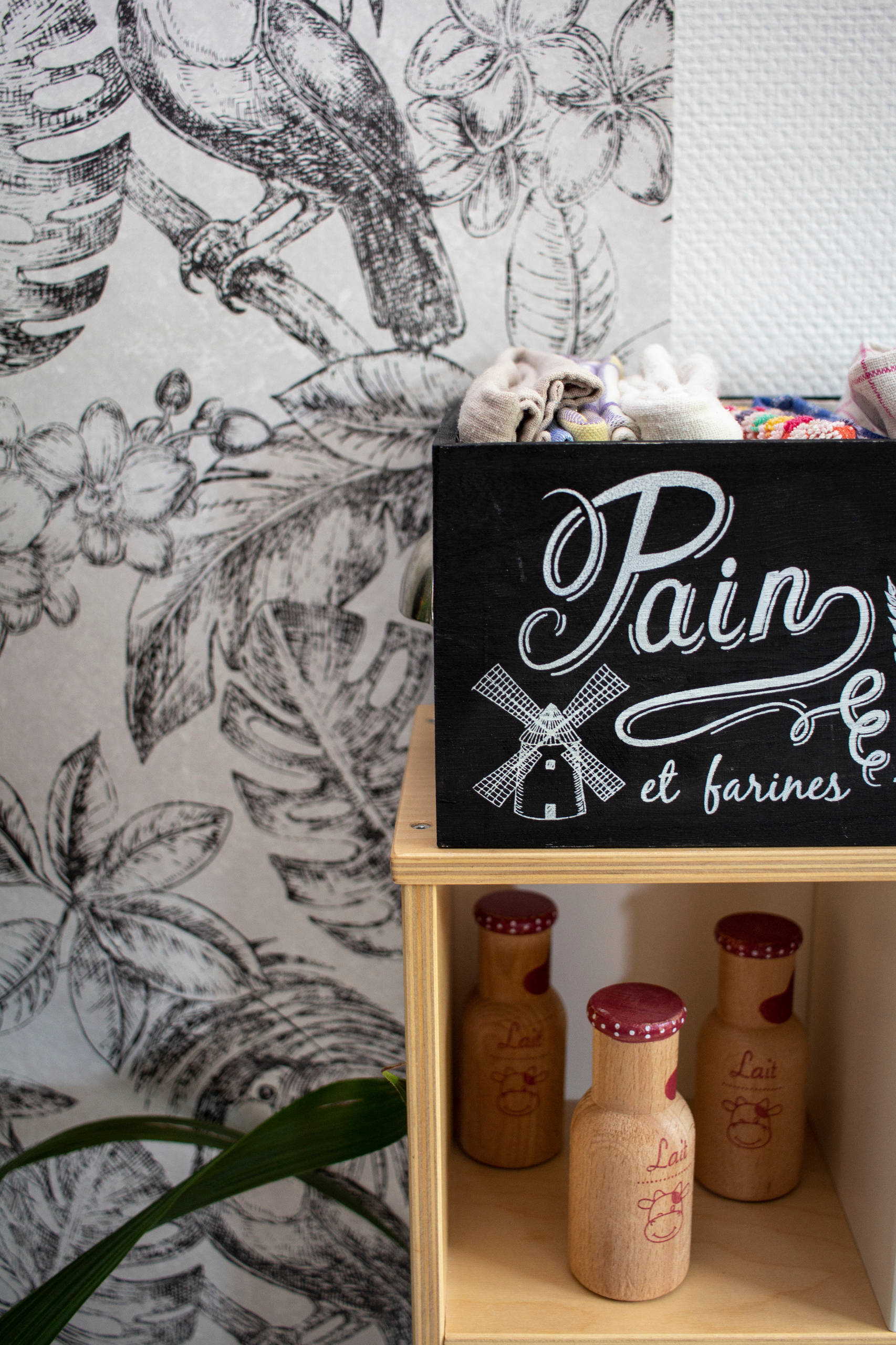 Au-dessus de la cuisine d’Ornella, dans la boîte à pain noire, Estelle range les torchons de vaisselle, les sacs de course en tissus et autre tote bag, une autre de ses habitudes conso-responsables.
