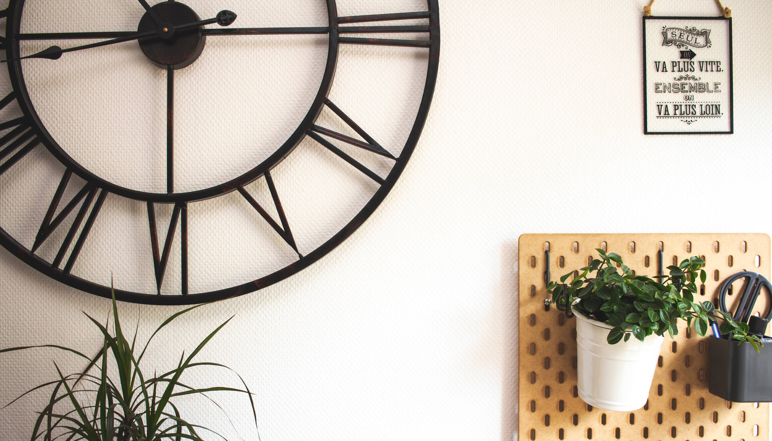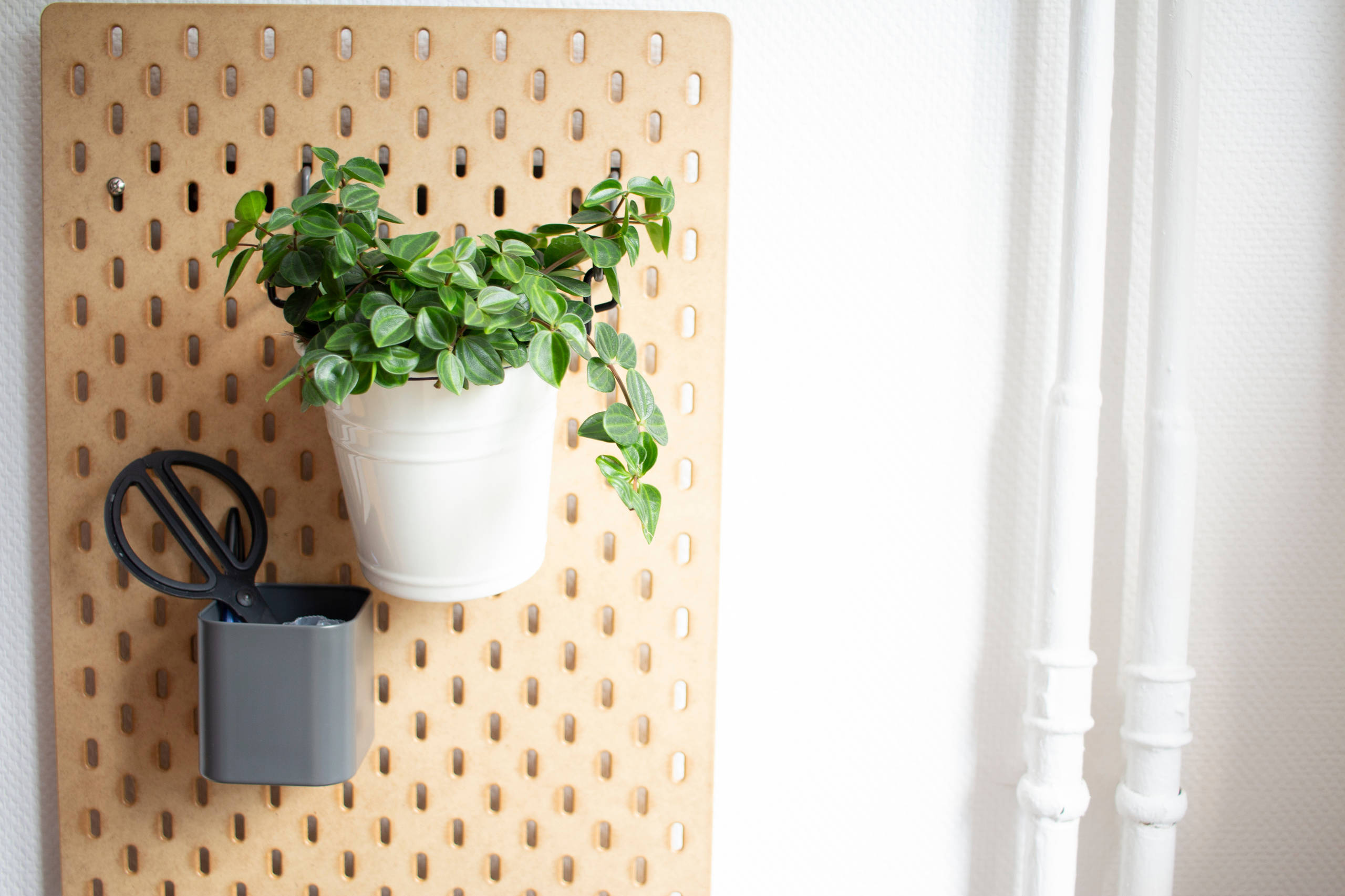 Au-dessus du radiateur, elle a ajouté ce panneau perforé : « C’est un élément déco emprunté aux ateliers. Grâce à des crochets on suspend les éléments que l’on veut. C’est très pratique ! »