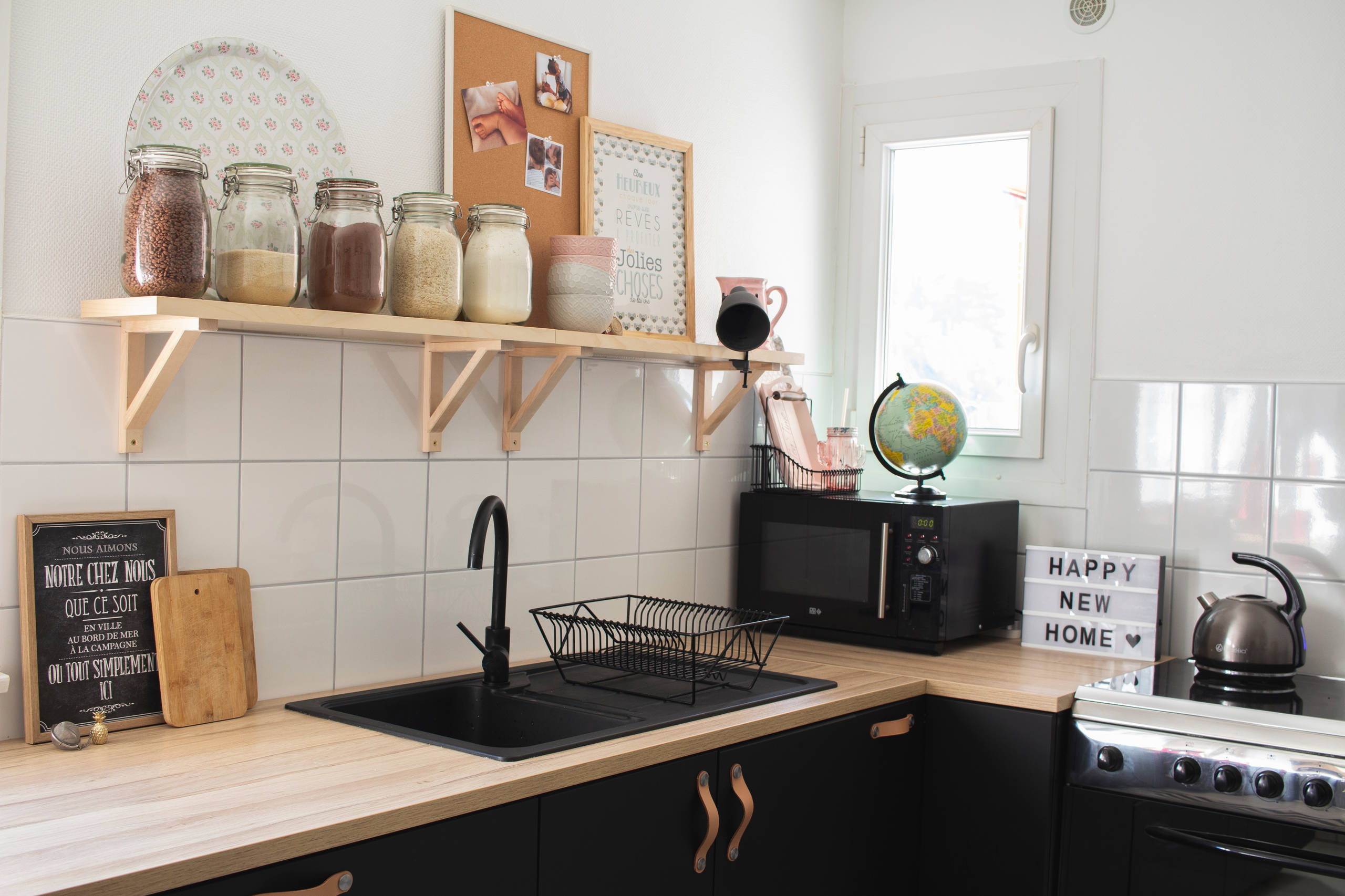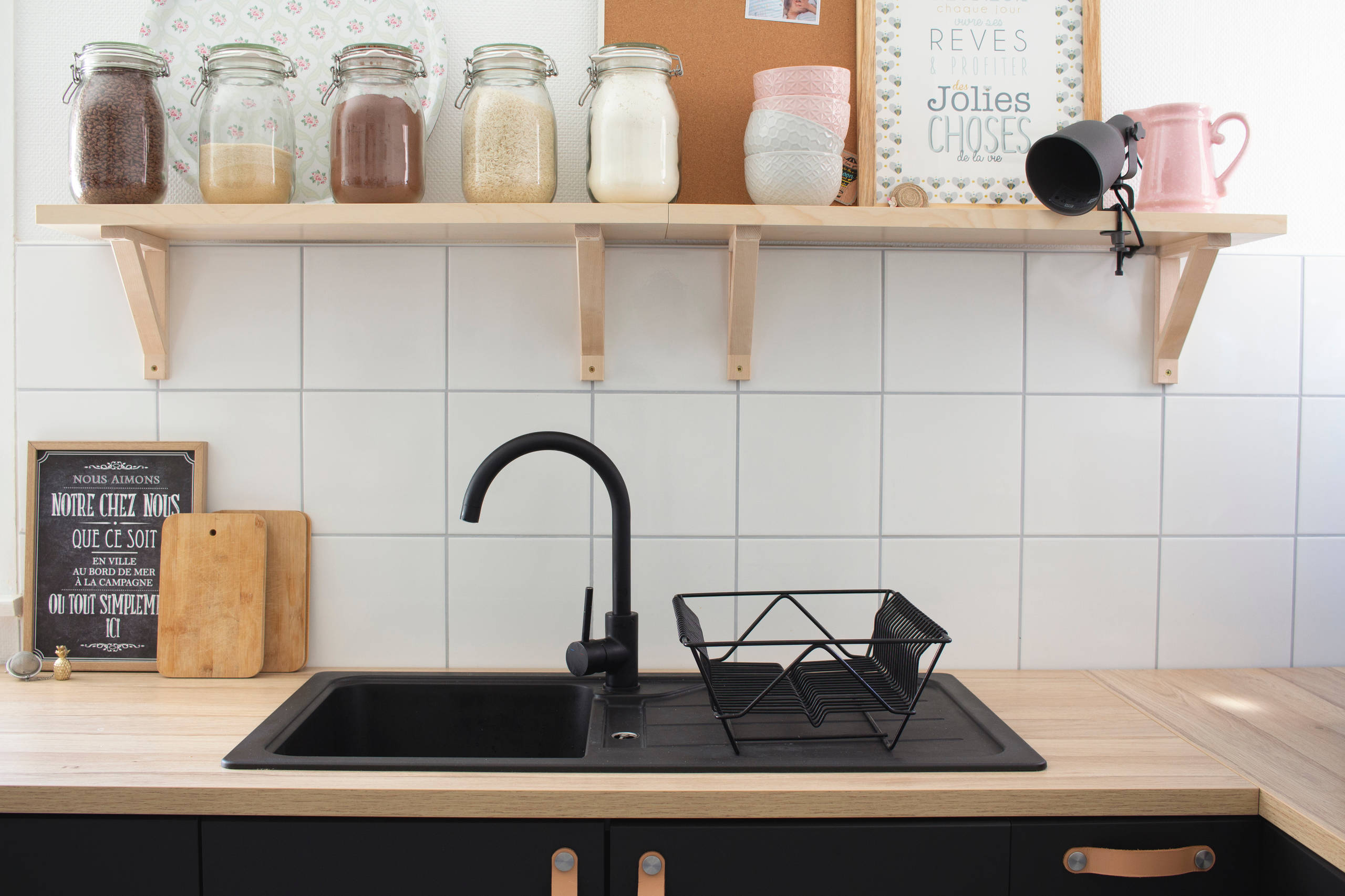 Assortis au mobilier, l’évier en résine noire et son mitigeur proviennent de chez Brico Dépôt. « Malheureusement le robinet s’écaille déjà », déplore la jeune femme.