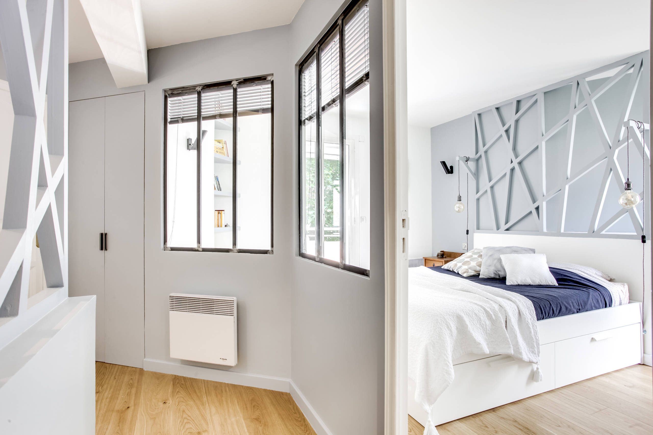 On retrouve le motif du claustra au niveau de la tête de lit, que l’on aperçoit depuis l’escalier. Un élégant jeu de plans. « Le menuisier que j’ai sollicité me prenait pour une folle avec toutes mes idées. Mais entre les verrières et les claustras, je voulais que rien n’entrave la lumière. À certaines heures de la journée, on peut assister à un véritable jeu d’ombres », raconte l’architecte d’intérieur.