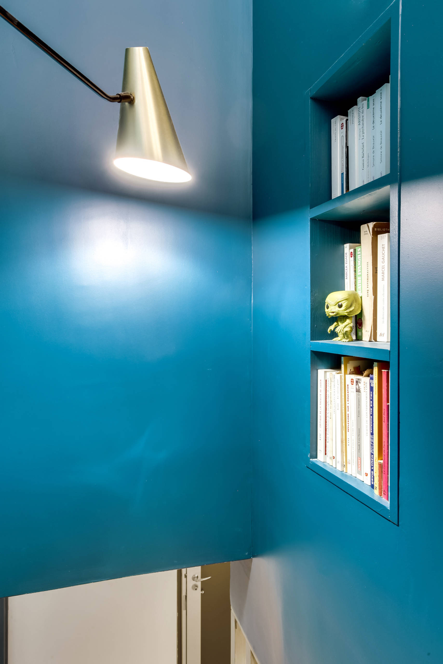 La montée d’escalier et le mur du bureau ont été peints avec une couleur forte pour donner du peps à l’ensemble. Mais choisir la teinte n’a pas été simple car le couple a eu du mal à se décider. Si l’un voulait du bleu, l’autre penchait pour du vert. Un compromis a été trouvé avec ce bleu canard.