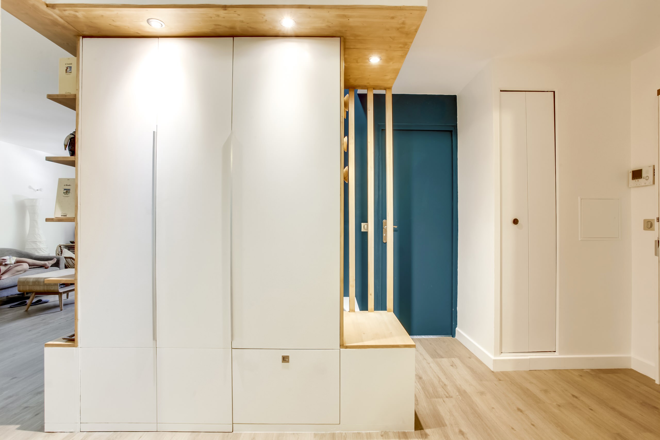 Pour relooker cette entrée, il a été nécessaire de tirer parti de certaines contraintes de l’appartement. « Il existait un retombé de poutre que je ne pouvais pas toucher. », explique Aline Frémery. « J’ai décidé de l’intégrer à l’entrée et de m’en amuser en le soulignant avec un chemin lumineux. » Pour marquer la montée d’escalier, un claustra a été réalisé dans le même bois.