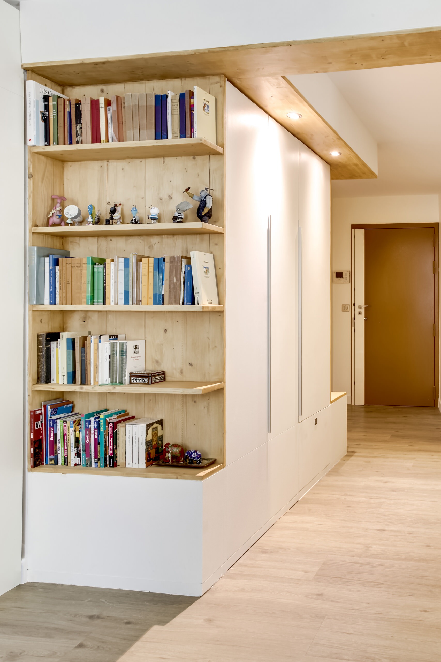 « Le couple souhaitait une entrée utile, avec beaucoup de rangements », précise Aline Frémery, qui a ainsi dessiné un placard d’un seul tenant réalisé par un artisan menuisier. Avec ses penderies, ses tiroirs, mais aussi son banc qui permet d’enfiler ses chaussures, cet ensemble monobloc allie design et praticité. Les placards et étagères sont en medium et en sapin.