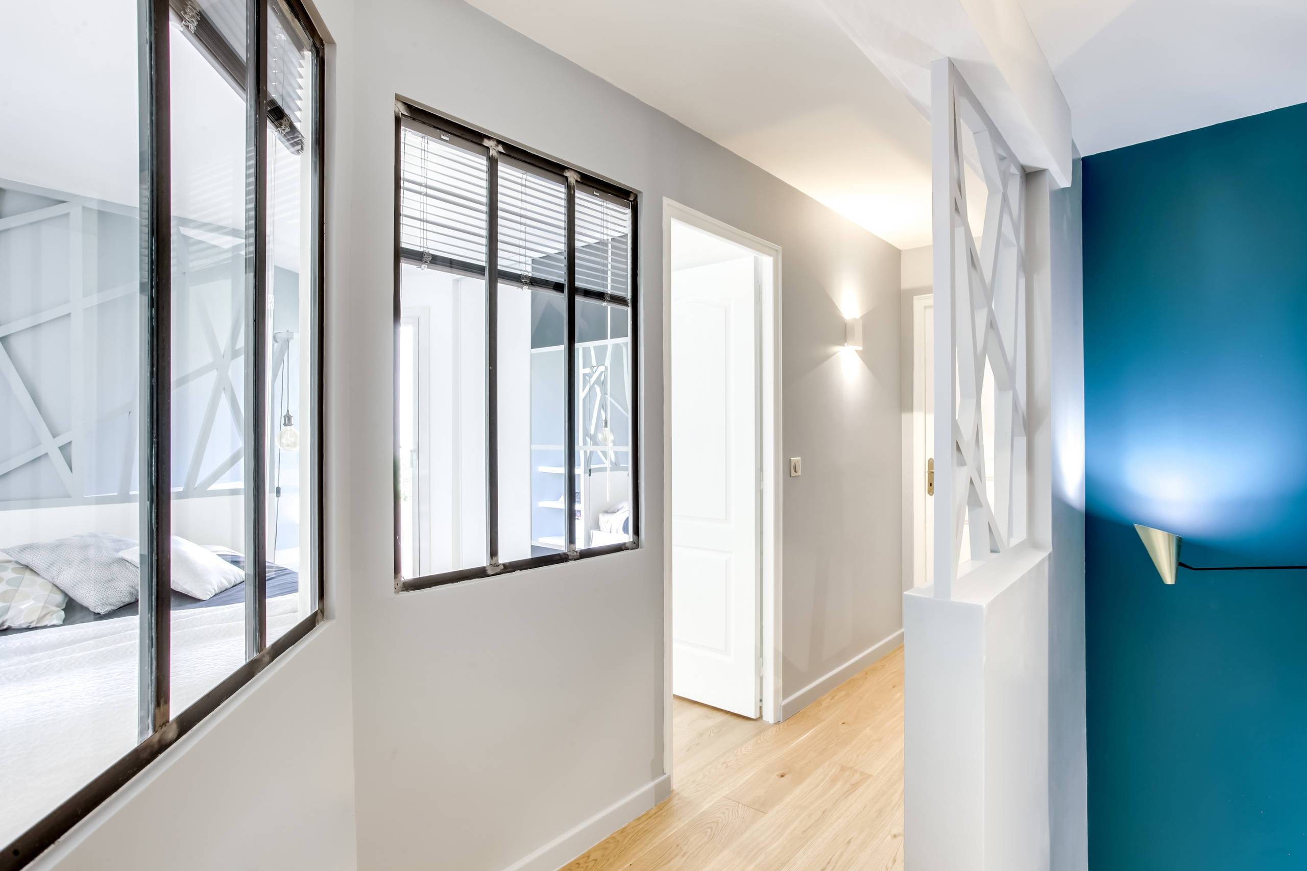 Dans la partie nuit, l’espace a été redistribué pour créer une troisième chambre à la place d’un grand palier inoccupé, d’une vingtaine de mètres carrés. La naissance d’une nouvelle chambre de 14 m² avec dressing avait de quoi ravir les parents, mais rendait le couloir aveugle. Afin de pallier le manque de luminosité, des verrières ont été installées.