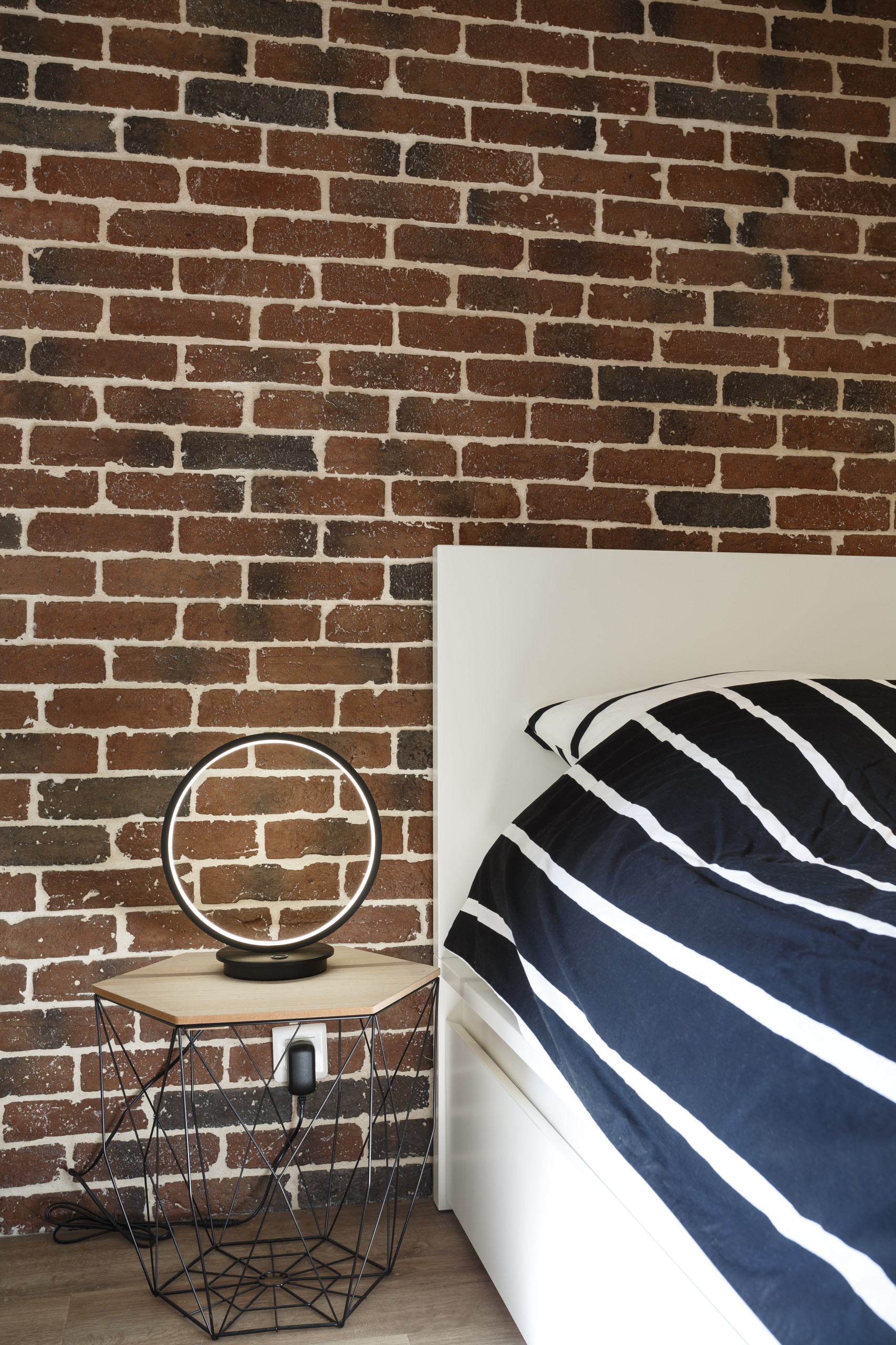 Après. Les propriétaires appréciaient les briques, qui font partie du paysage dans leur commune. La tête de lit a donc été parée de plaquettes de parement, d’une couleur plus classique que celle de la façade.