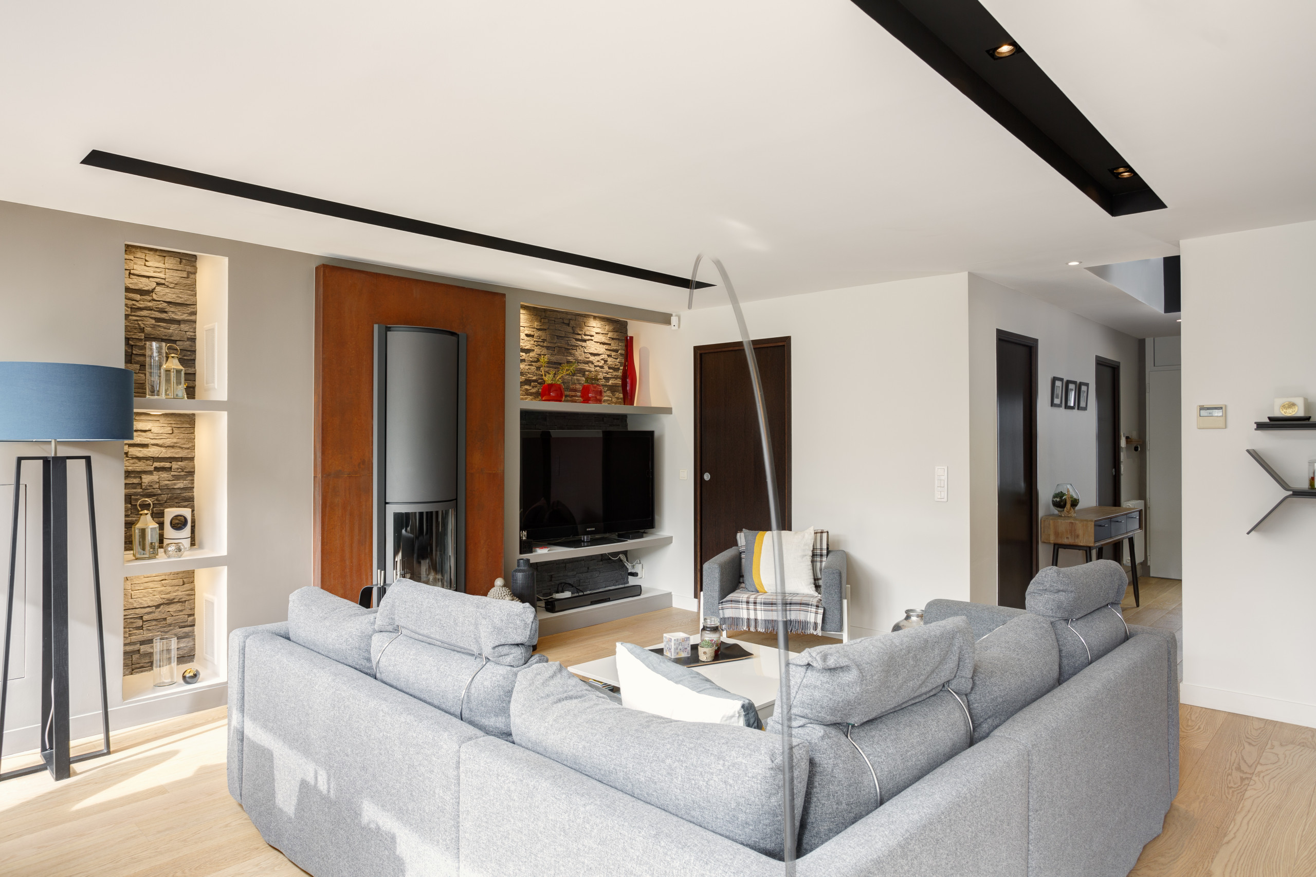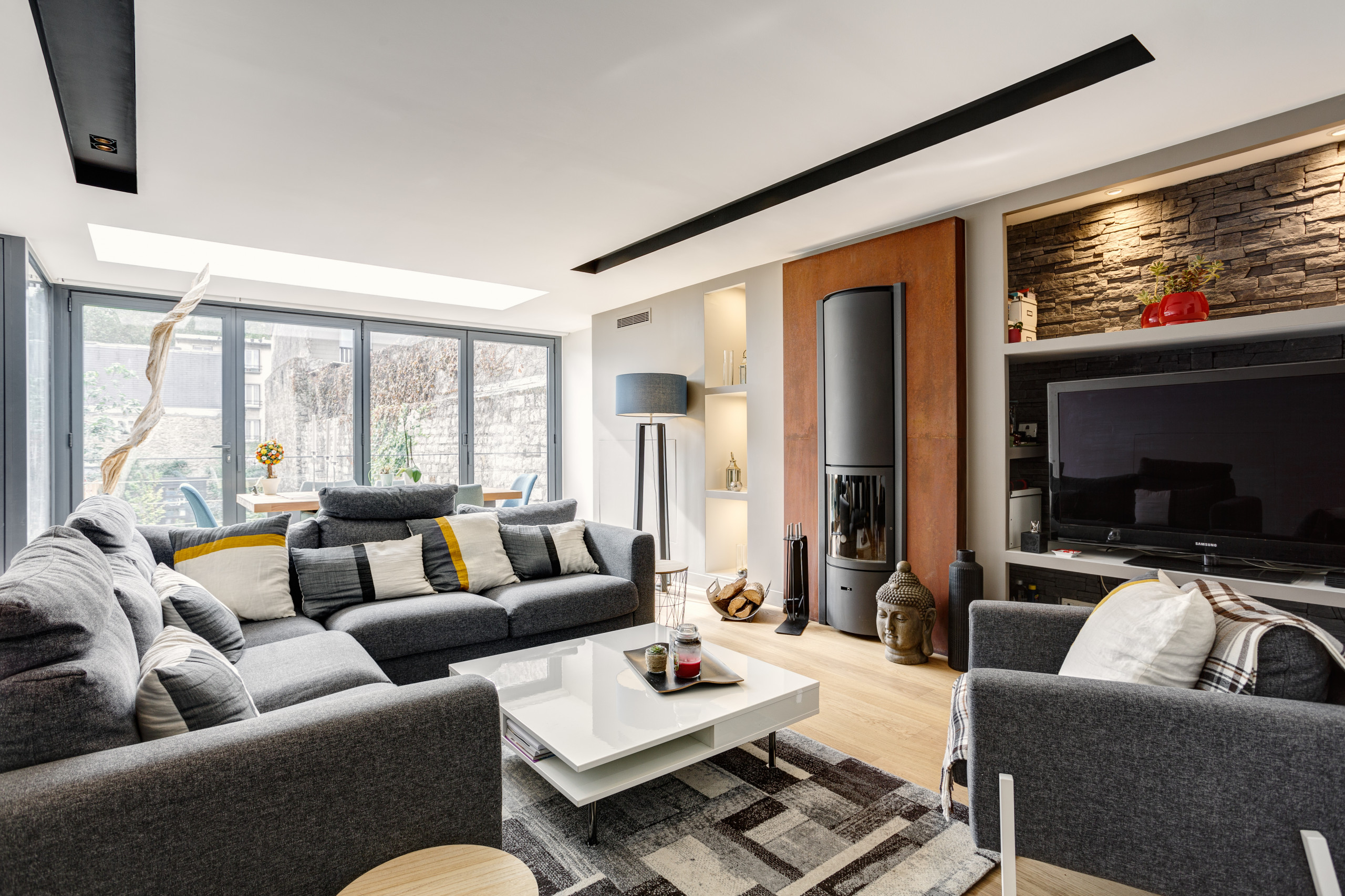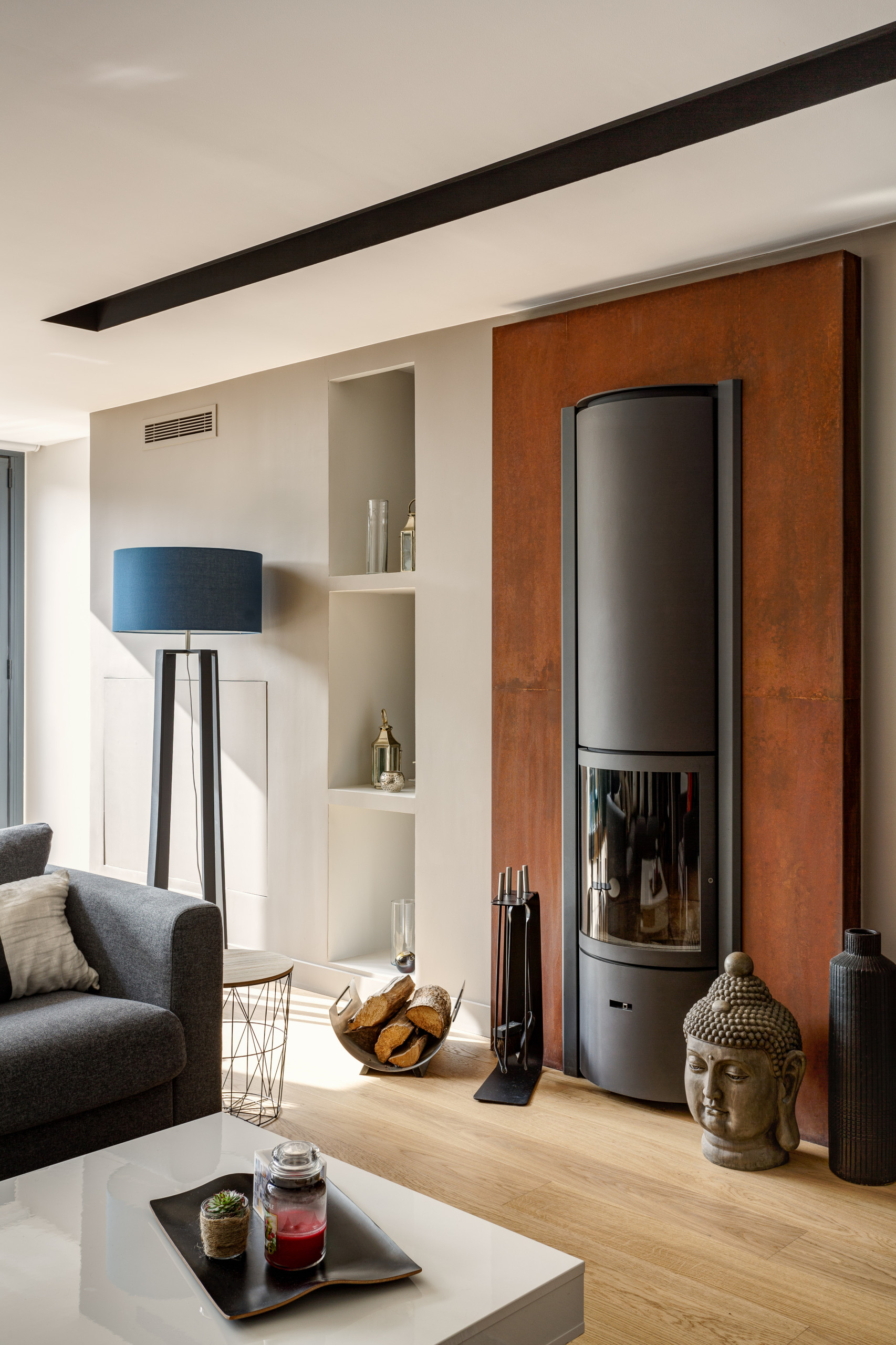 Le poêle à bois et son entourage de Corten appartenaient à la précédente rénovation. Posé par une entreprise spécialisée, celui-ci était parfaitement en état et avait permis au couple de compenser leur problème de chauffage dans la pièce.