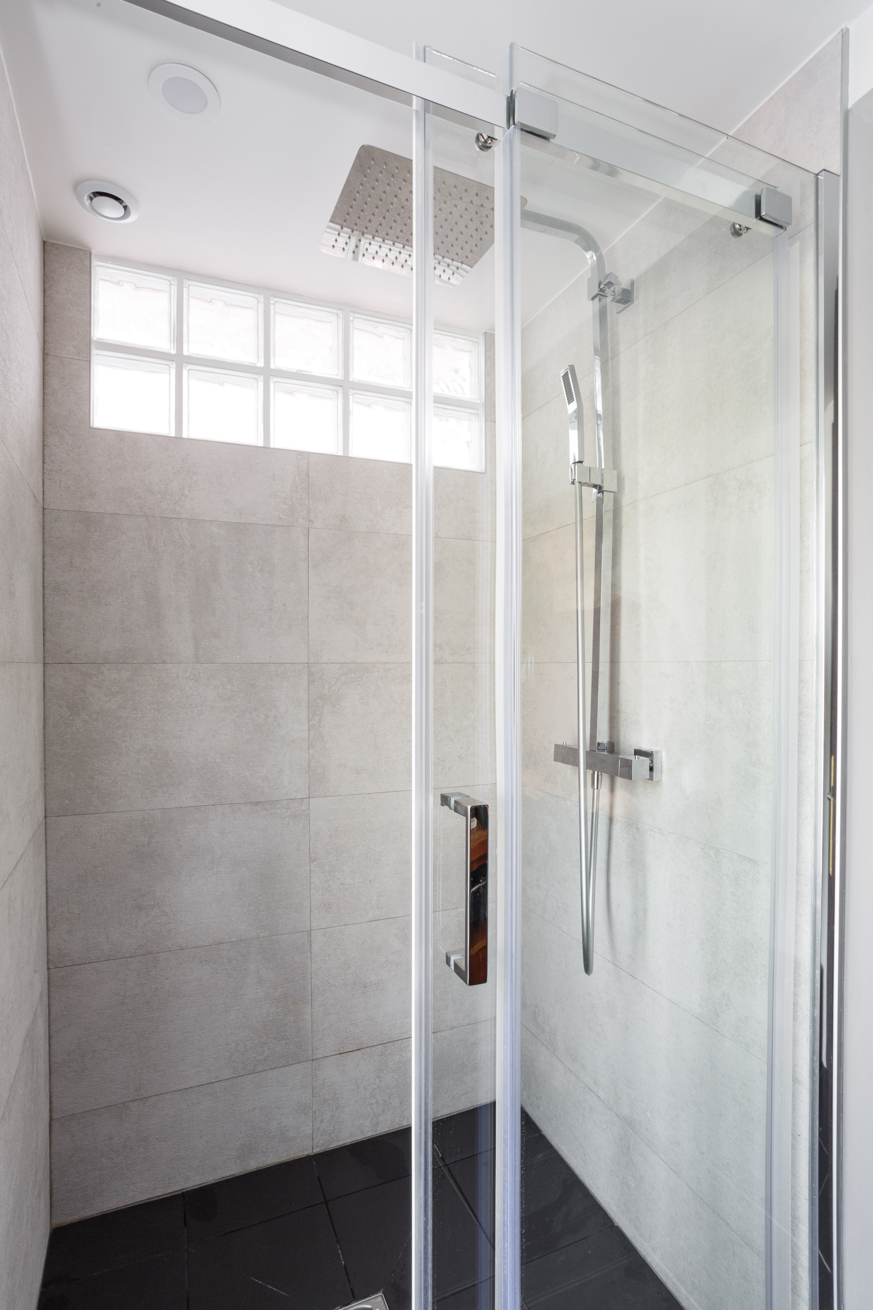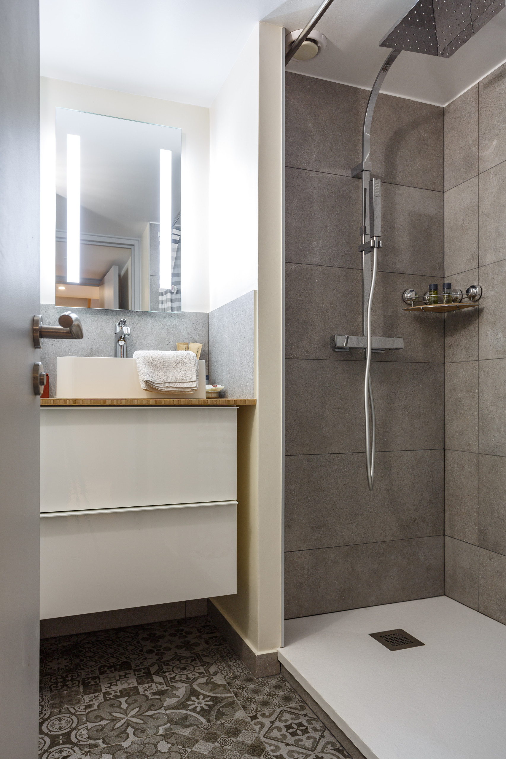 La petite surélévation a permis d’ajouter deux bandes de carreaux de verre en partie haute de la douche et donc de gagner en hauteur et en clarté.
