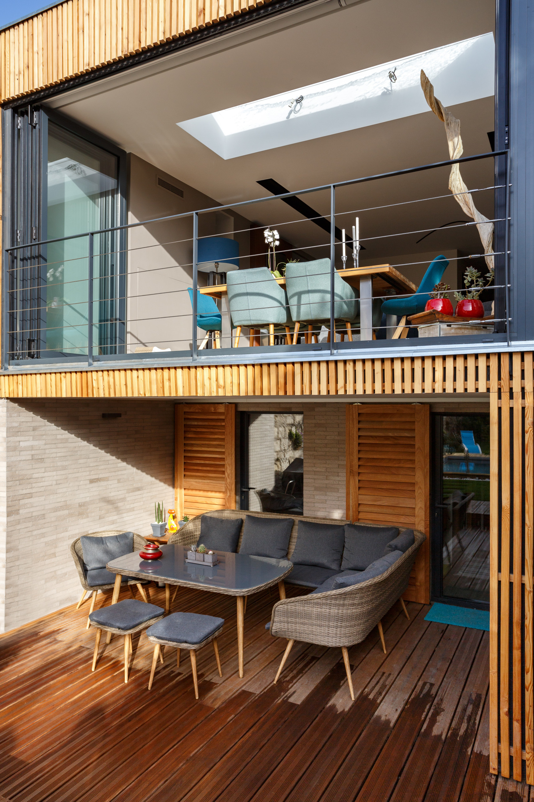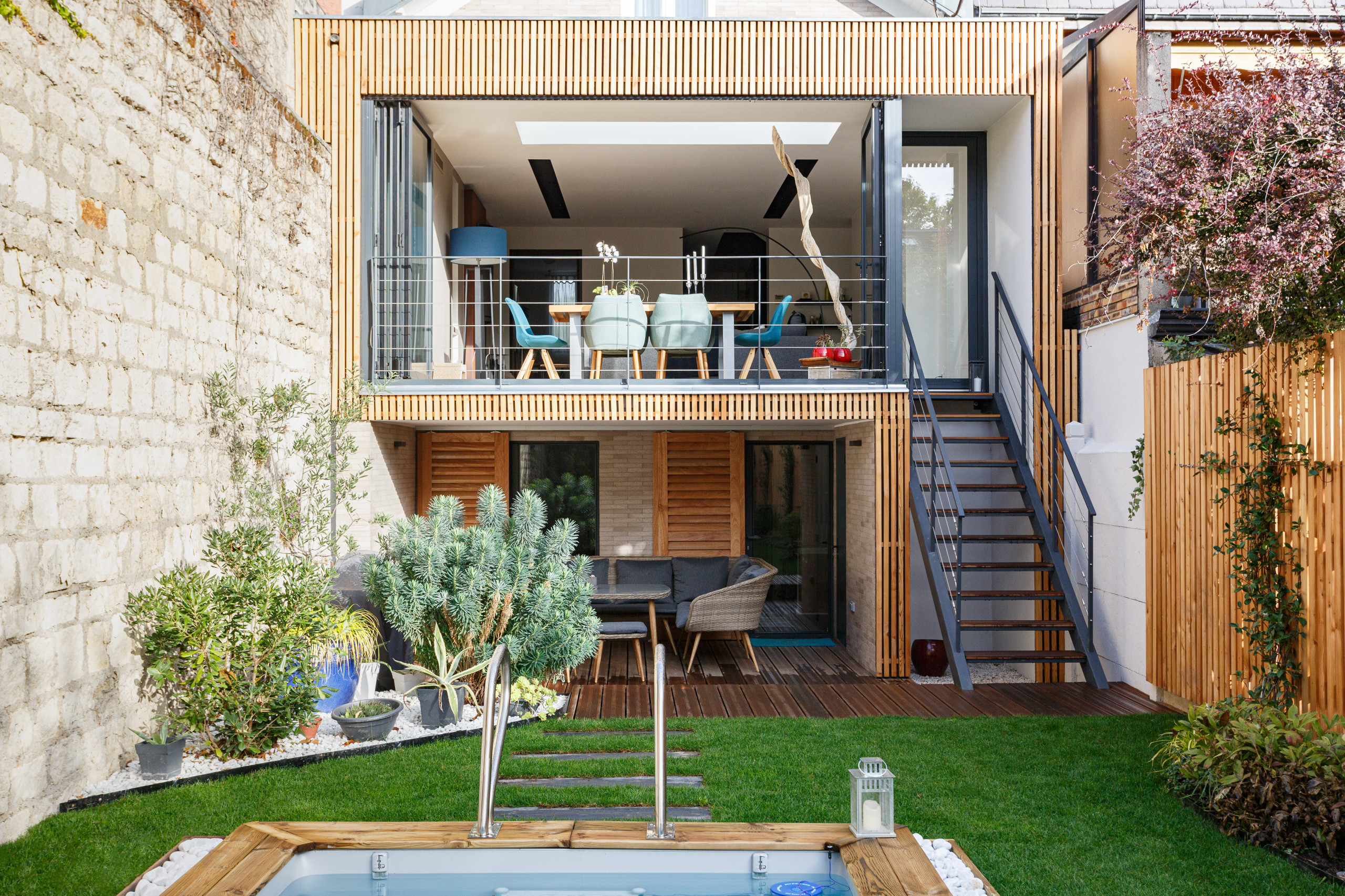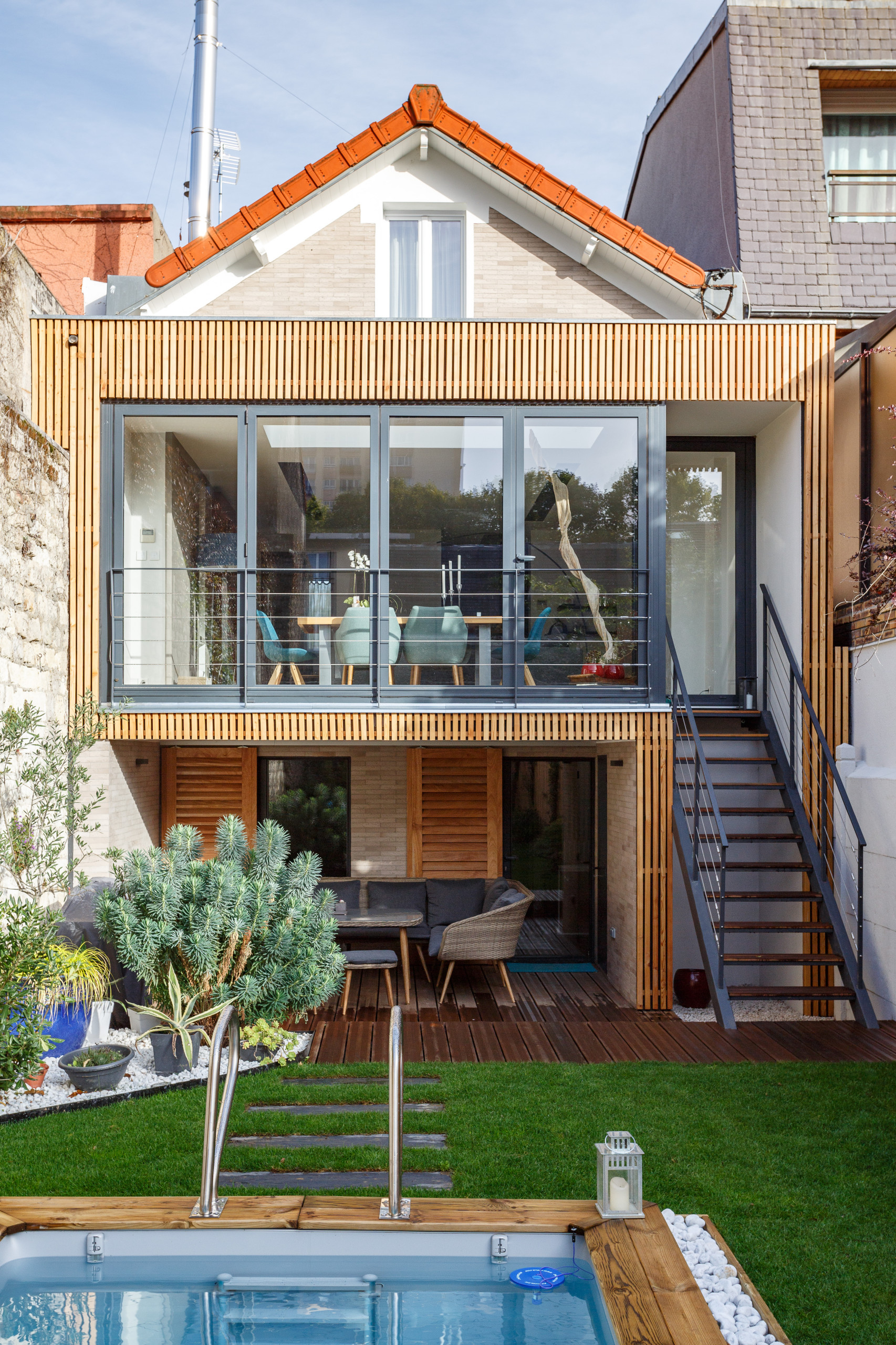Pour ajouter une note chaleureuse, la cour anglaise et l’abri à vélo ont été bardés pour leur part de bois de mélèze.