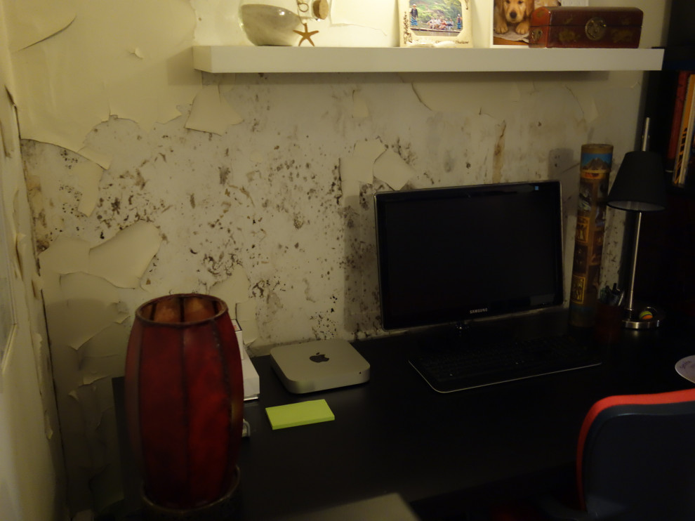 Par ailleurs, l’isolation avait été installée à même la paroi sans lame d’air. Après le dégât des eaux, elle s’était gorgée d’eau, imbibant les plâtres et les faisant moisir comme on le voit ici dans le bureau. Résultat, les murs pourrissaient et il a donc fallu déposer tout le doublage.