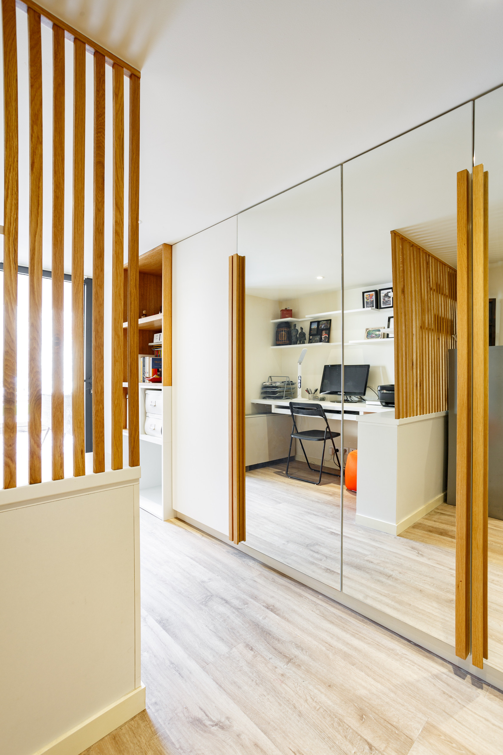 Quitte à tout refaire, Émilie Melin en a profité pour apporter quelques améliorations aux agencements de départ afin de coller au plus près aux besoins actuels des propriétaires. Elle a donc légèrement déplacé la cloison entre la chambre et le bureau de sorte à créer un très grand placard de rangement côté bureau. Elle a également proposé de scinder le bureau en deux avec un claustra afin de créer un espace pour les appareils de sport.