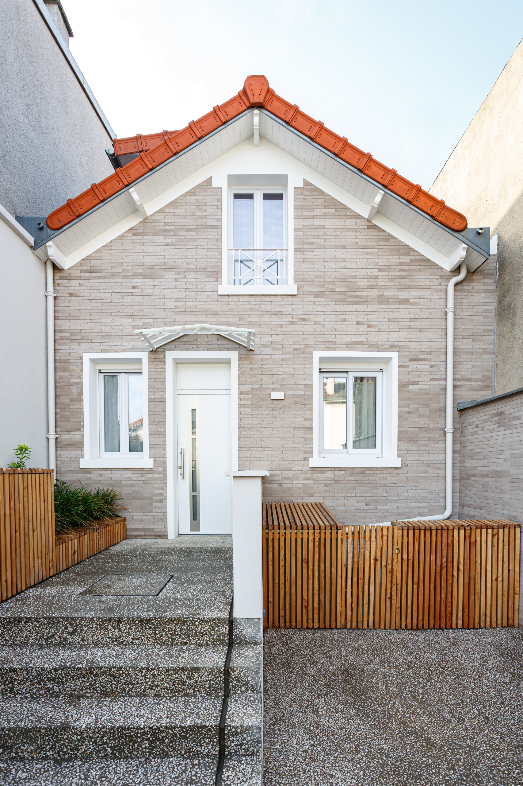 Après. Pour redonner du panache à la façade Il a été convenu de la rehausser avec un parement briques, dans le style des maisons ouvrières de banlieue parisienne. Mais la réalisation a rencontré elle aussi son lot d’imprévus : « Les propriétaires avaient choisi une plaquette gris foncé, mais il y a eu un problème de référence à la commande. Mon entreprise a été obligée d’aller en chercher en urgence en Belgique où seule cette couleur beige/gris était disponible de suite. Heureusement elle plaisait aux propriétaires… Ils ont trouvé le résultat très heureux et leurs voisins les ont mêmes complimentés », relate Émilie.