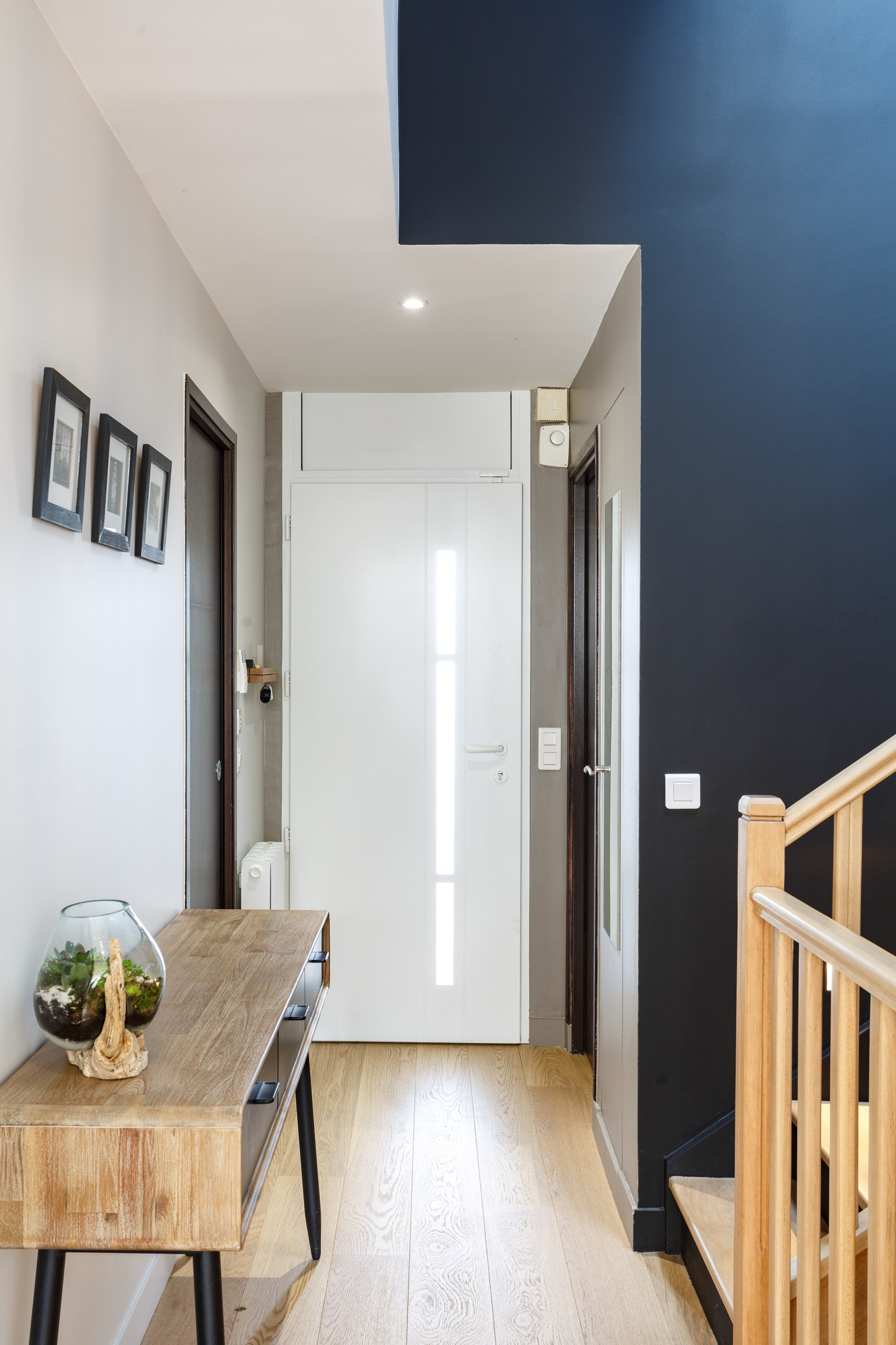 Foncé à l’origine, l’escalier en chêne qui distribue tous les étages de la maison a été poncé pour retrouver sa couleur naturelle. Les contremarches ont été peintes en noir pour prolonger les contrastes initiés au salon. Au pied des murs, un chemin lumineux a été pensé par l’architecte dans un souci à la fois design et sécuritaire.
