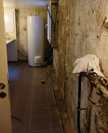 « Tous les murs ont été grattés et purgé, puis badigeonnés avec un produit “adjuvant hydrofuge” contre le sel et le salpêtre. On peut voir sur ce cliché de la buanderie les trous des injections. À partir de là, il a fallu attendre six mois que les murs traités soient bien secs avant de réisoler avec de la laine de roche, imputrescible, et de refermer les cloisons », explique Émilie.